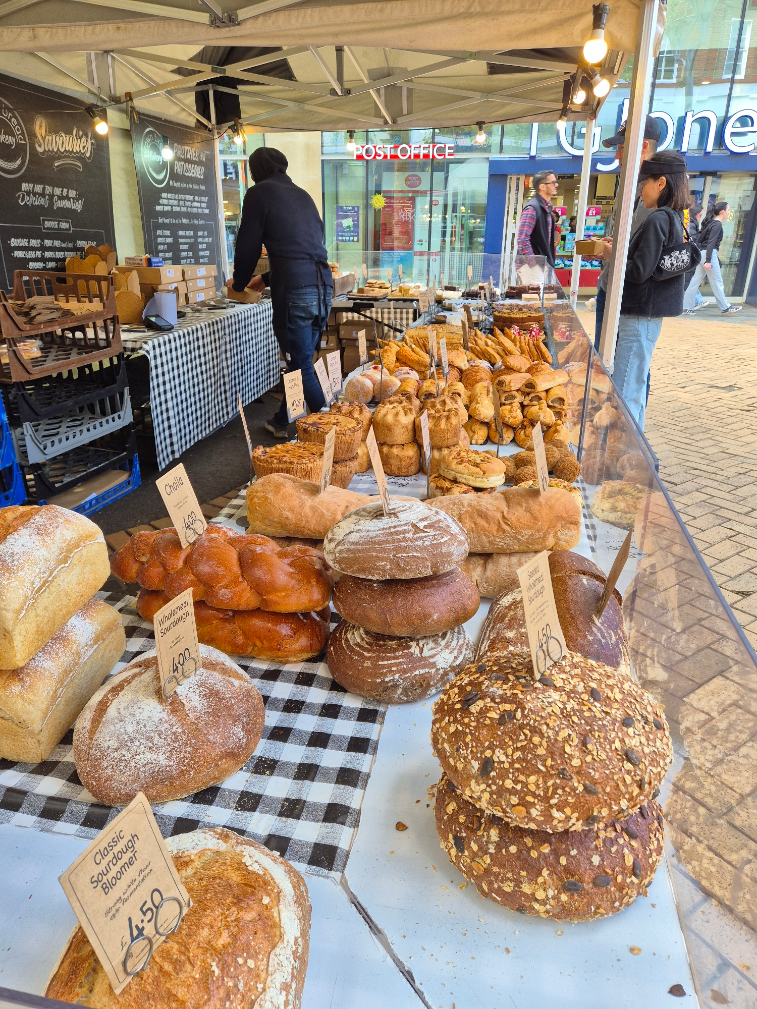 The image shows a bread stand in Chelmsford, United Kingdom, near a "Post Office" and "Fone" store. The stand has a variety of bread loaves and pastries displayed on a checkered tablecloth. A man is reaching over the display to purchase bread, and a couple is standing near the glass display. A sign lists various "Savouries" and "Pastries". The bread prices are displayed on small tags. The stand is set up under a tent-like structure with overhead lights. Crate holders sit underneath the table. | Open Wire