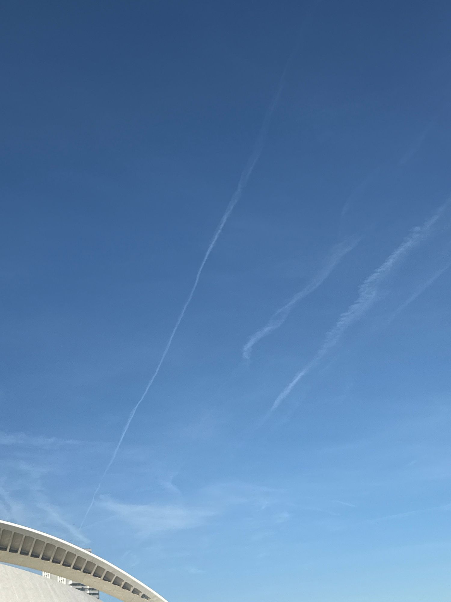 The image shows a clear blue sky with several contrails, likely from airplanes. In the lower right corner, part of a white, arched architectural structure is visible, which is likely the Pont de l'Ass…read more