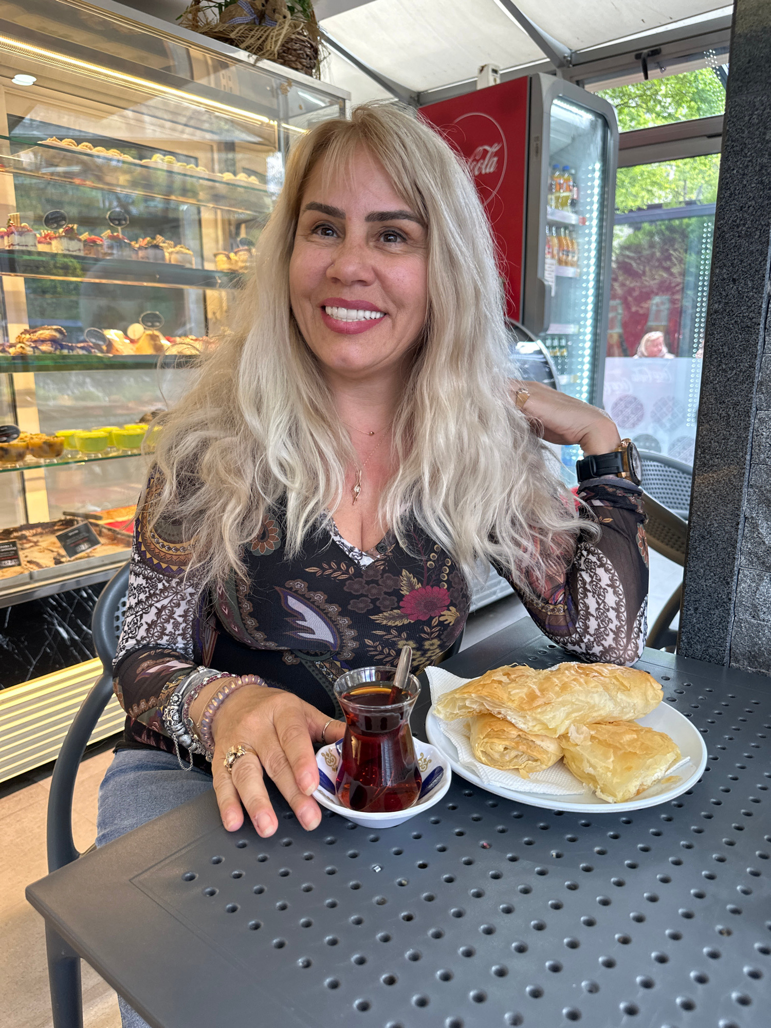 The image captures a cheerful woman seated at an outdoor or semi-outdoor cafe in Sofia, Bulgaria, enjoying a tea and pastry break. The photo is rotated 90 degrees counter-clockwise. The primary subje…read more