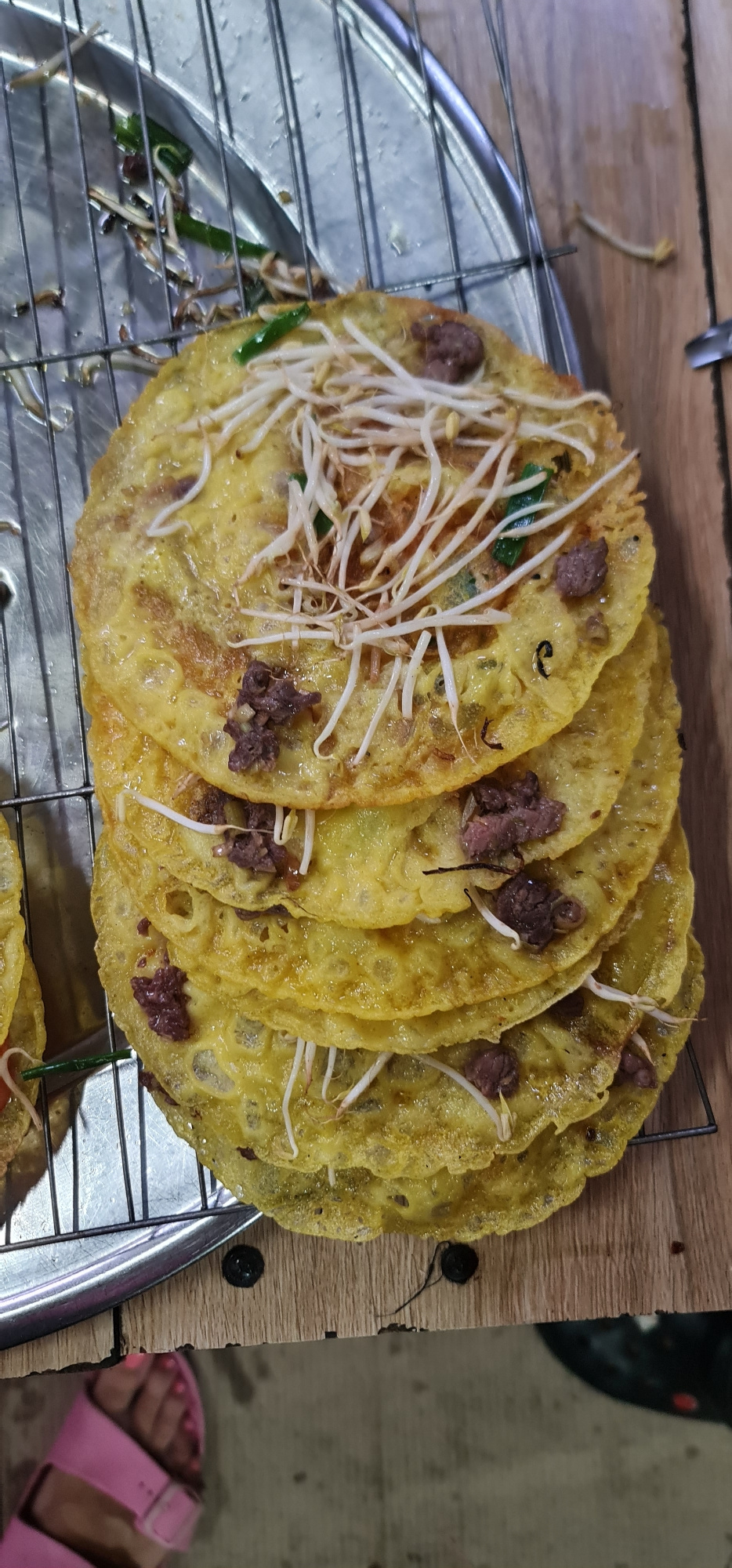 This close-up shot features several freshly prepared Bánh xèo, a traditional Vietnamese savory pancake, likely from a street food stall or a casual eatery in Đà Nẵng, Vietnam. The main subjects are m…read more