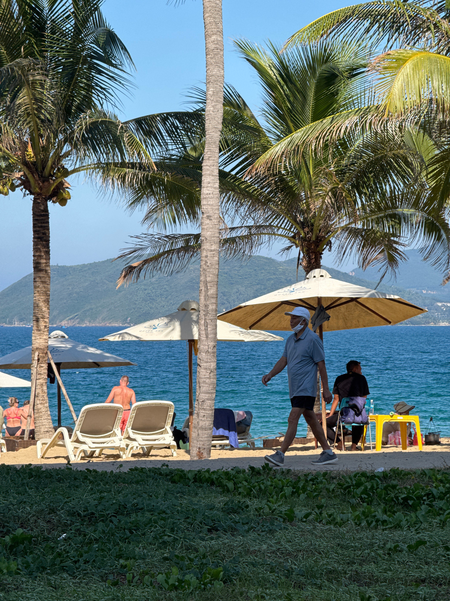 The image depicts a beachfront scene in Nha Trang, Vietnam, specifically the beach area adjacent to the Queen Ann Nha Trang Hotel, as evidenced by the hotel logo on beach umbrellas. The scene is capt…read more
