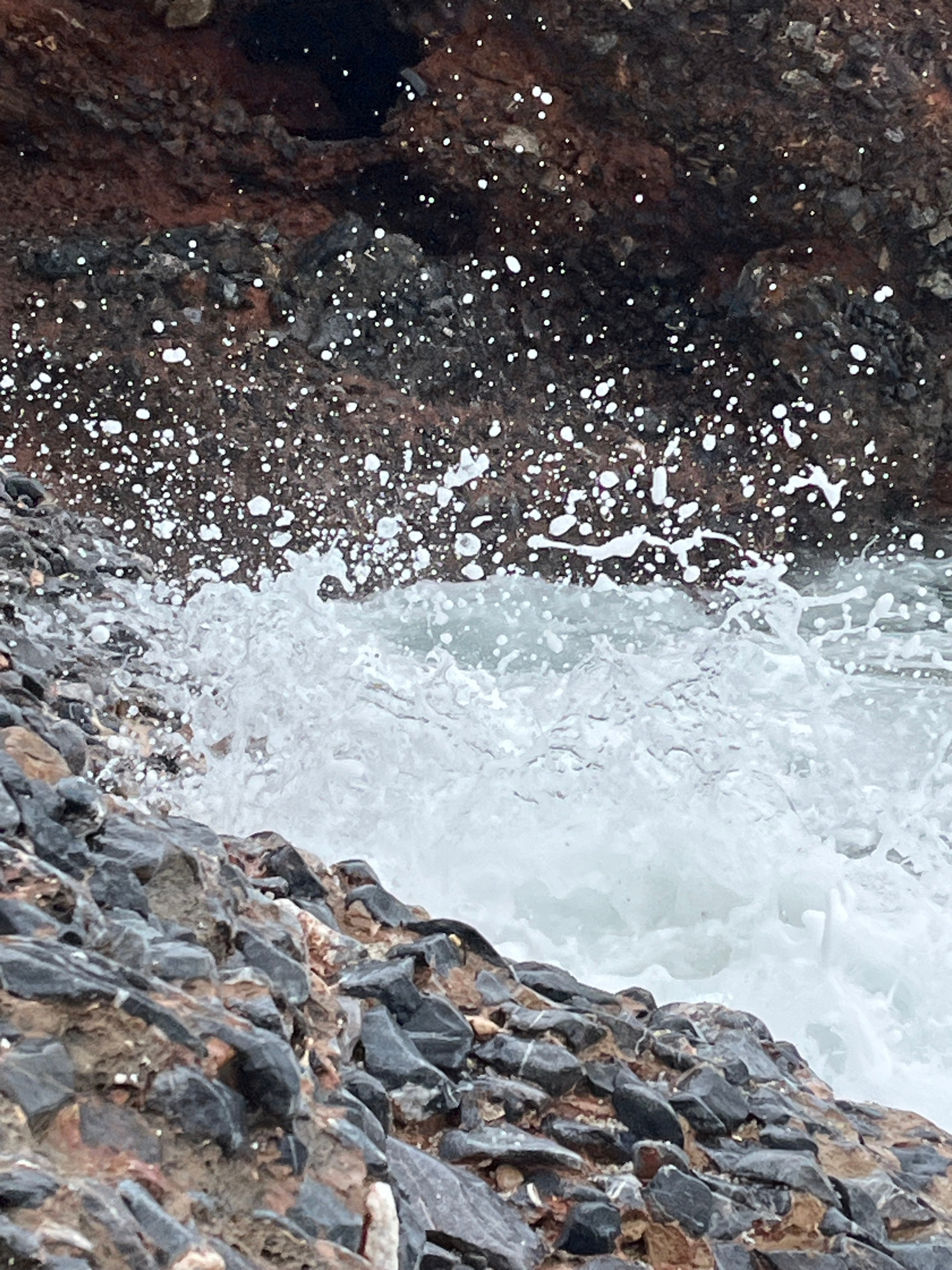 This image captures a close-up view of sea waves interacting with a rocky coastline in Alanya, Turkey. Turbulent white sea water is depicted in the mid-ground, actively crashing against dark, angular…read more
