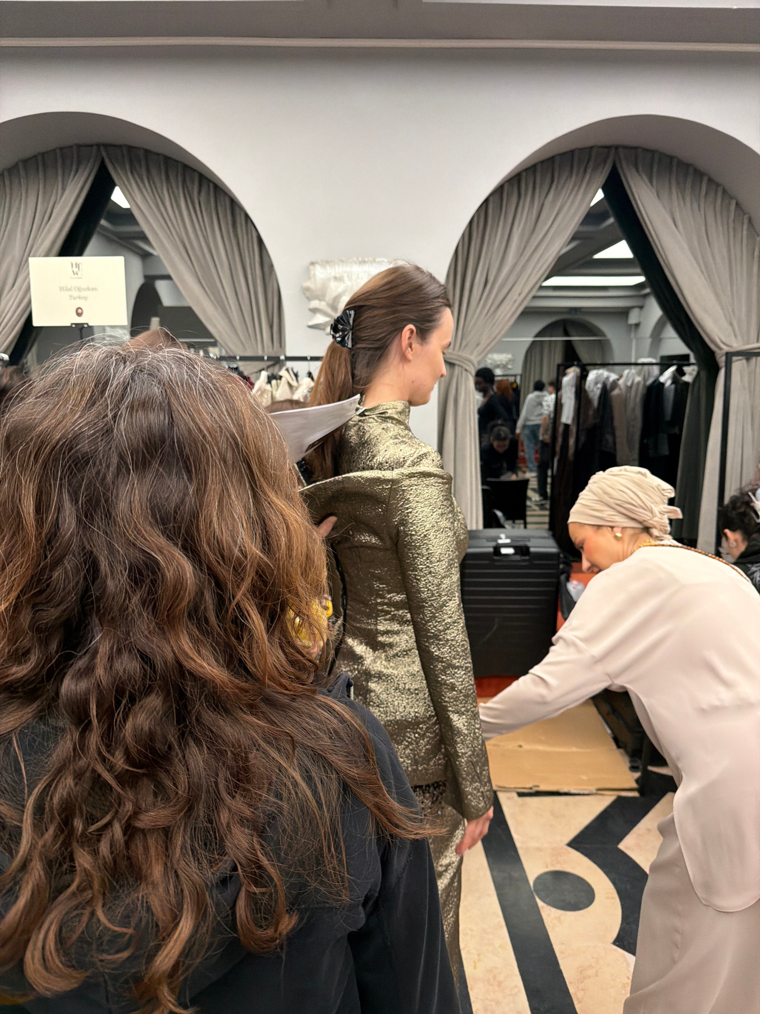 A vertically oriented image captures a behind-the-scenes moment, possibly in the fashion industry, likely in Paris, France, based on the presence of people and objects. The scene is indoors, possibly…read more