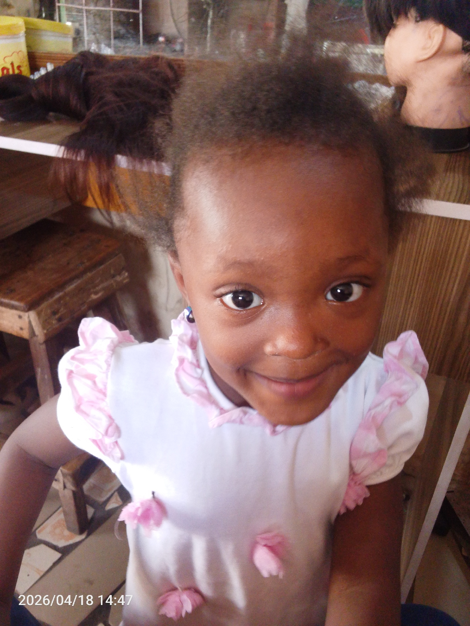 A young, dark-skinned child wearing a white shirt with pink ruffles on the sleeves and pink flower accents is looking directly at the camera and smiling. In the background, there is a wooden stool, a…read more