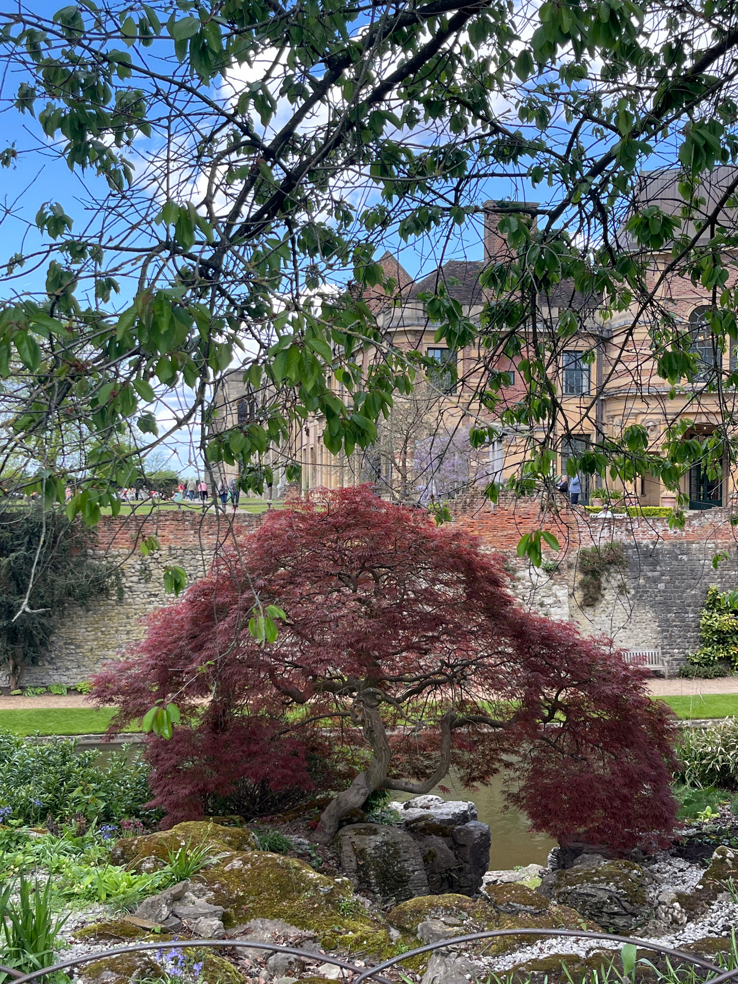 The image shows a garden scene in London, United Kingdom. A Japanese maple tree with red leaves dominates the right side of the frame, next to a rocky edge with moss and vegetation. To the left, a treβ¦read more
