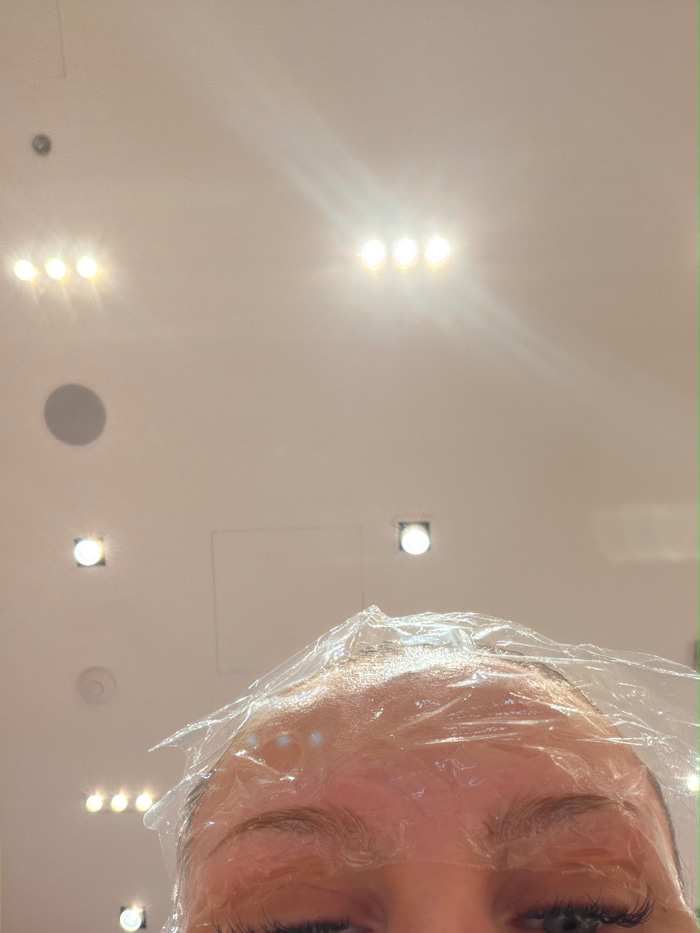 A person's face, partially covered in clear plastic, dominates the right side of the frame. They are looking directly downward. The background is a white or light-colored ceiling with multiple recesseβ¦read more