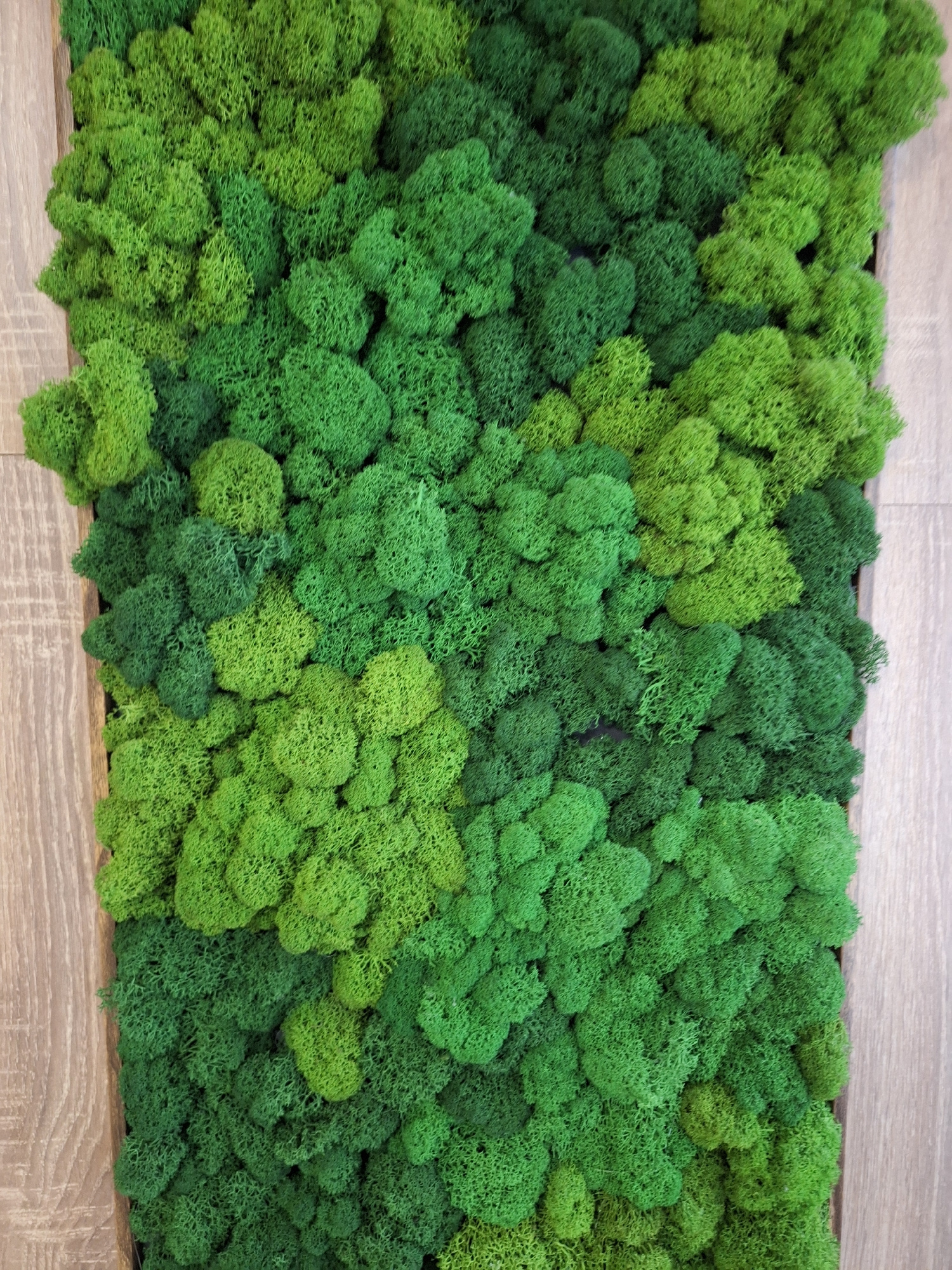 The image shows a close-up of a framed moss wall art piece. The moss is a vibrant green, with variations in shade suggesting different textures and depths within the arrangement. The framing material…read more