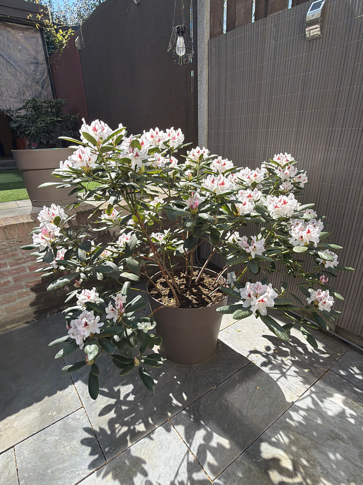 A medium shot captures a flowering rhododendron bush in a large pot on a tiled patio. The bush has a profusion of white flowers with small red markings. The pot is a neutral gray color. The patio is p…read more