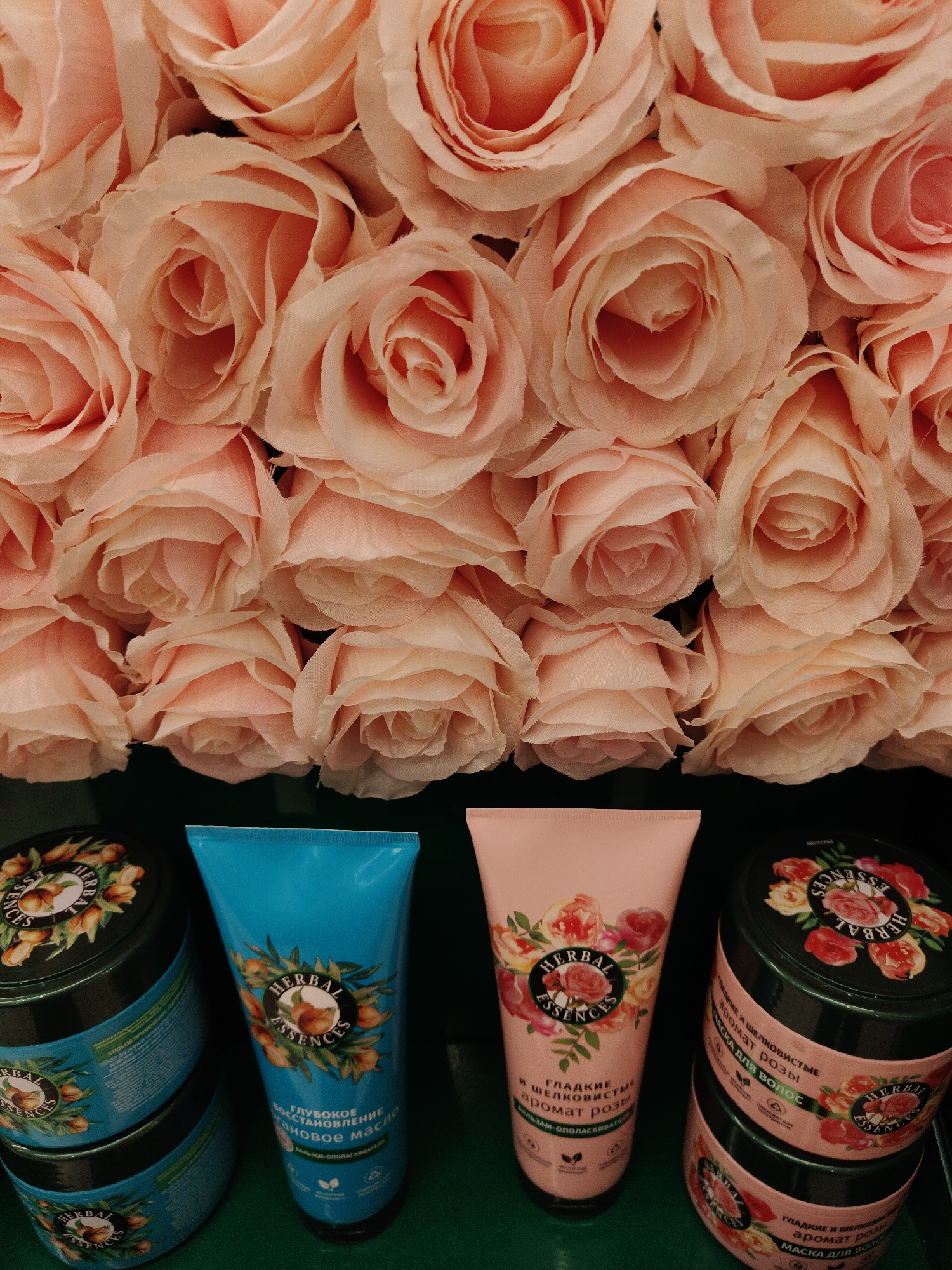 The image shows a collection of Herbal Essences hair care products arranged against a backdrop of numerous pale pink roses. The products consist of two types: tubs of hair mask and tubes of conditione…read more