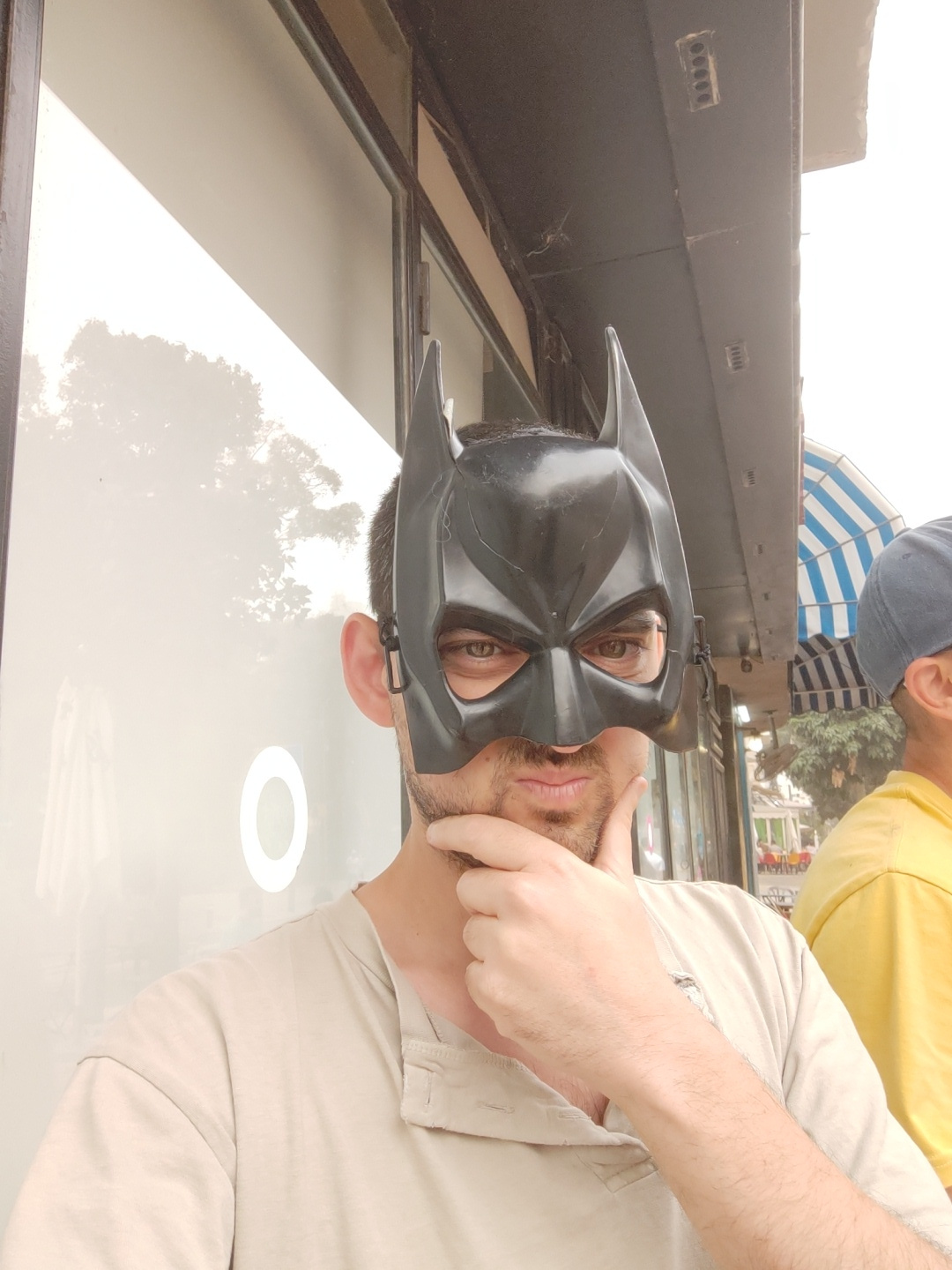 A man wearing a Batman mask is looking up at a skylight. He is wearing a beige shirt and has his hand to his face. Another person, wearing a yellow shirt and a blue baseball cap, is partially visible…read more