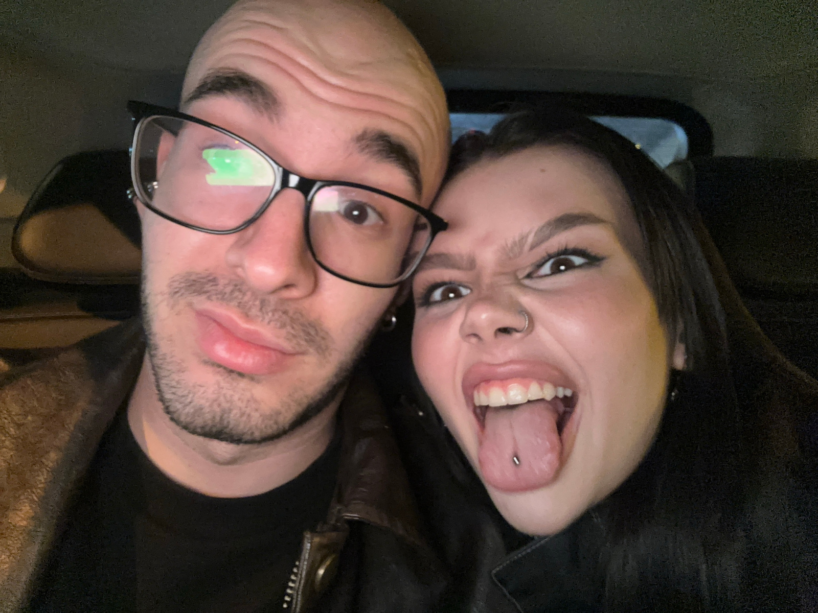 Two people are in the image, which has been rotated 180 degrees. On the left, a woman with dark hair is sticking her tongue out, revealing a tongue piercing. She also has a nose ring and visible eye m…read more