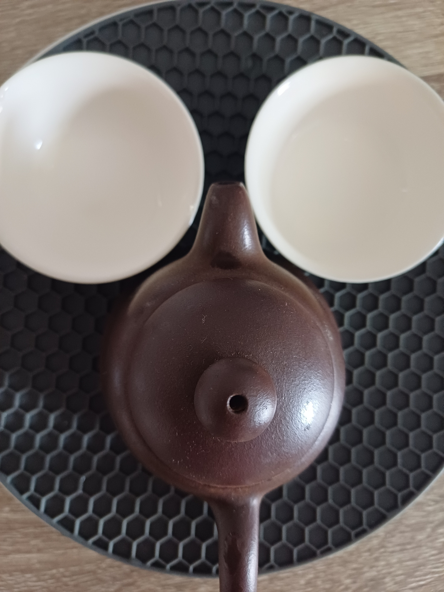 Two white teacups and a brown teapot sit on a gray, hexagonal patterned mat. The mat rests on a light brown surface. The photograph was likely taken in Gošići, Montenegro.