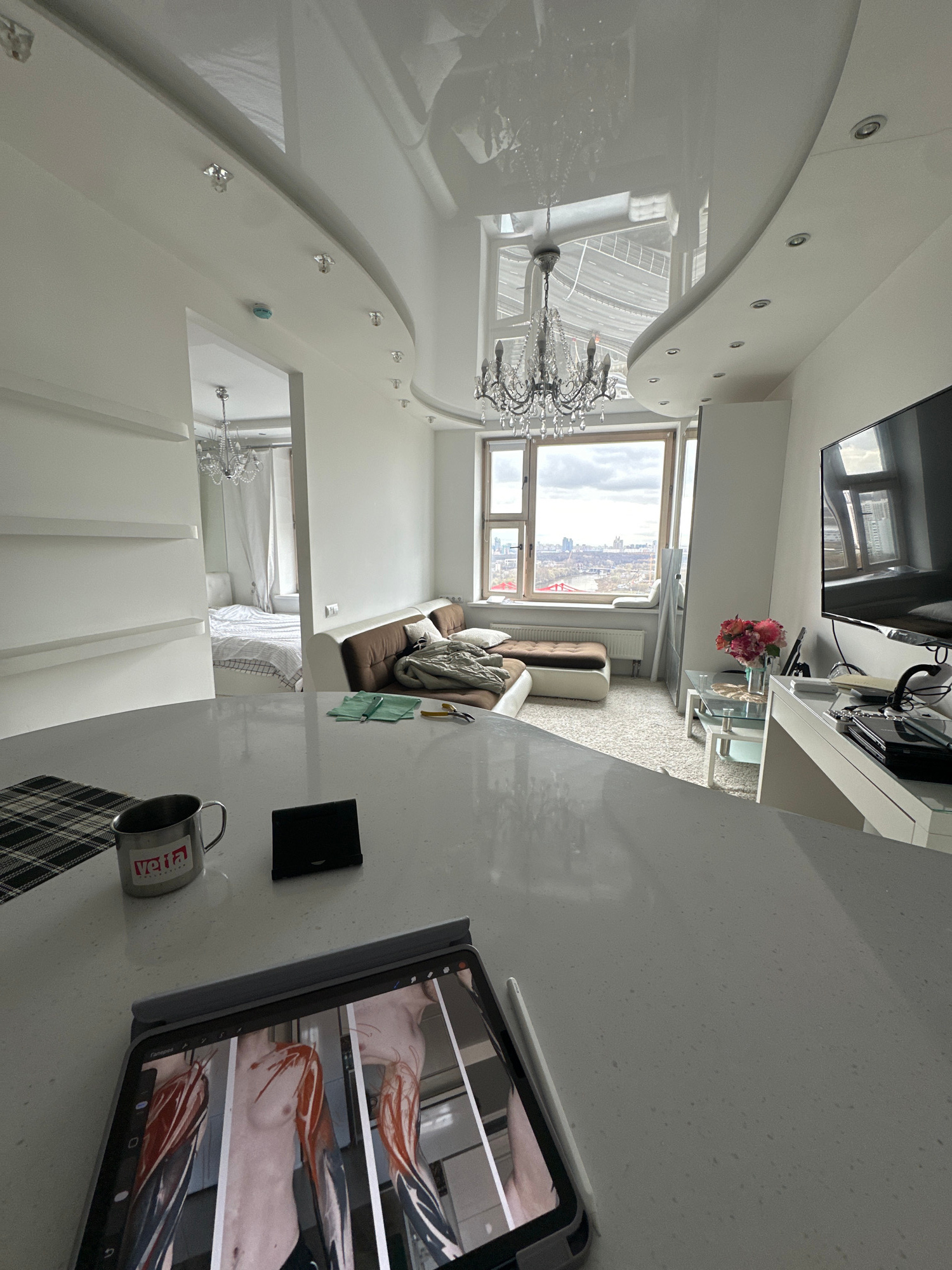 The image shows a modern, upscale apartment interior. The primary focus is on a bright, white kitchen counter where an iPad displays anatomical drawings. A mug and a notebook sit beside the iPad. In t…read more