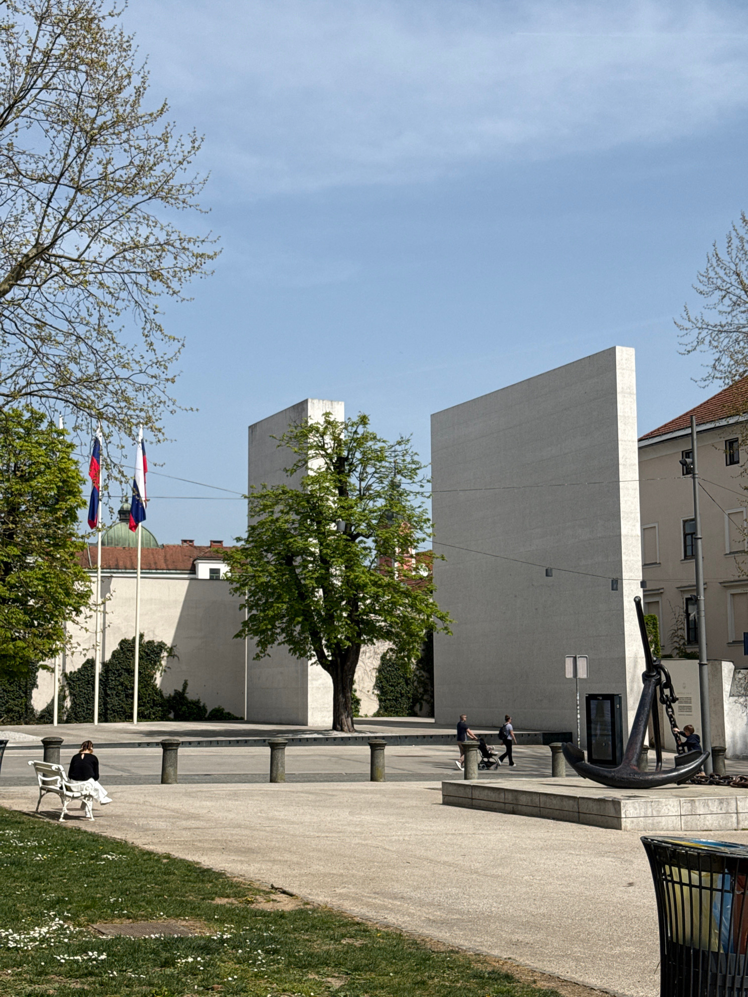 The photograph depicts a scene in Ljubljana, Slovenia, showcasing the memorial to fallen sailors and fishermen in Park Zvezda. A modern, white concrete structure forms the backdrop, with greenery incl…read more
