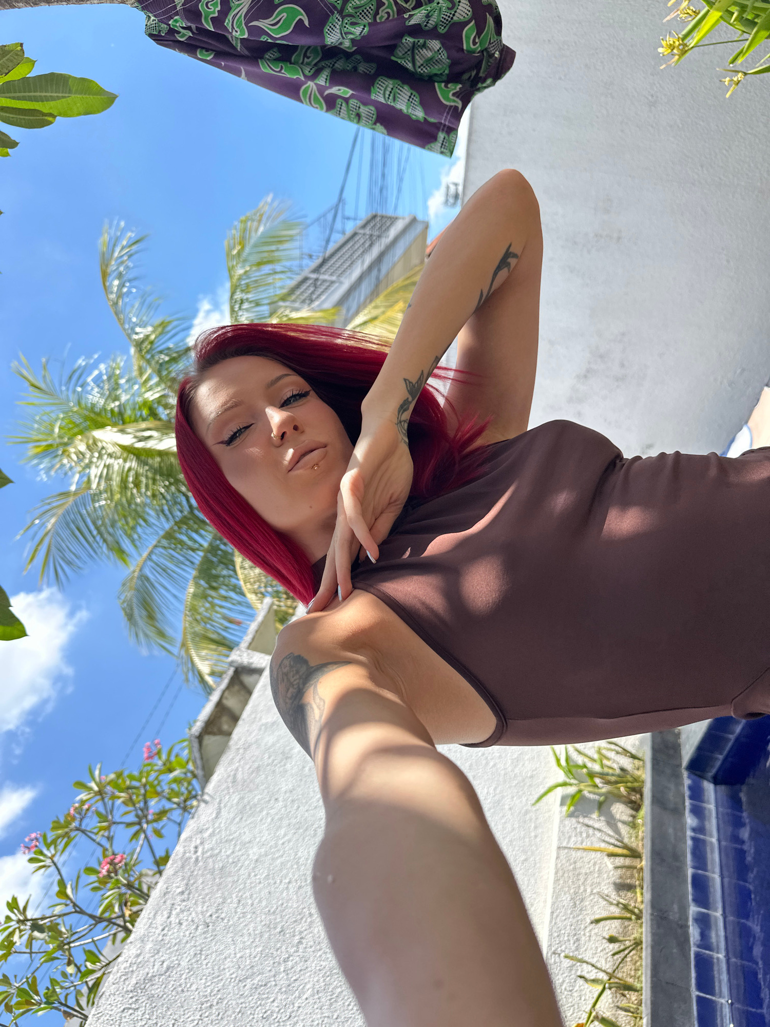 A woman with red hair and brown clothing is taking a selfie. She has tattoos on her arms. The background includes a blue sky, palm trees, and what appears to be a building. The location is likely Nort…read more
