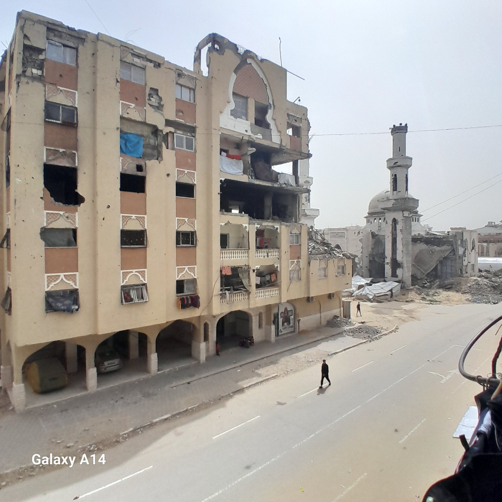 The image shows a severely damaged multi-story building in Khan Yunis, Palestinian Territory. The building has suffered significant structural damage, including collapsed sections and large holes in i…read more