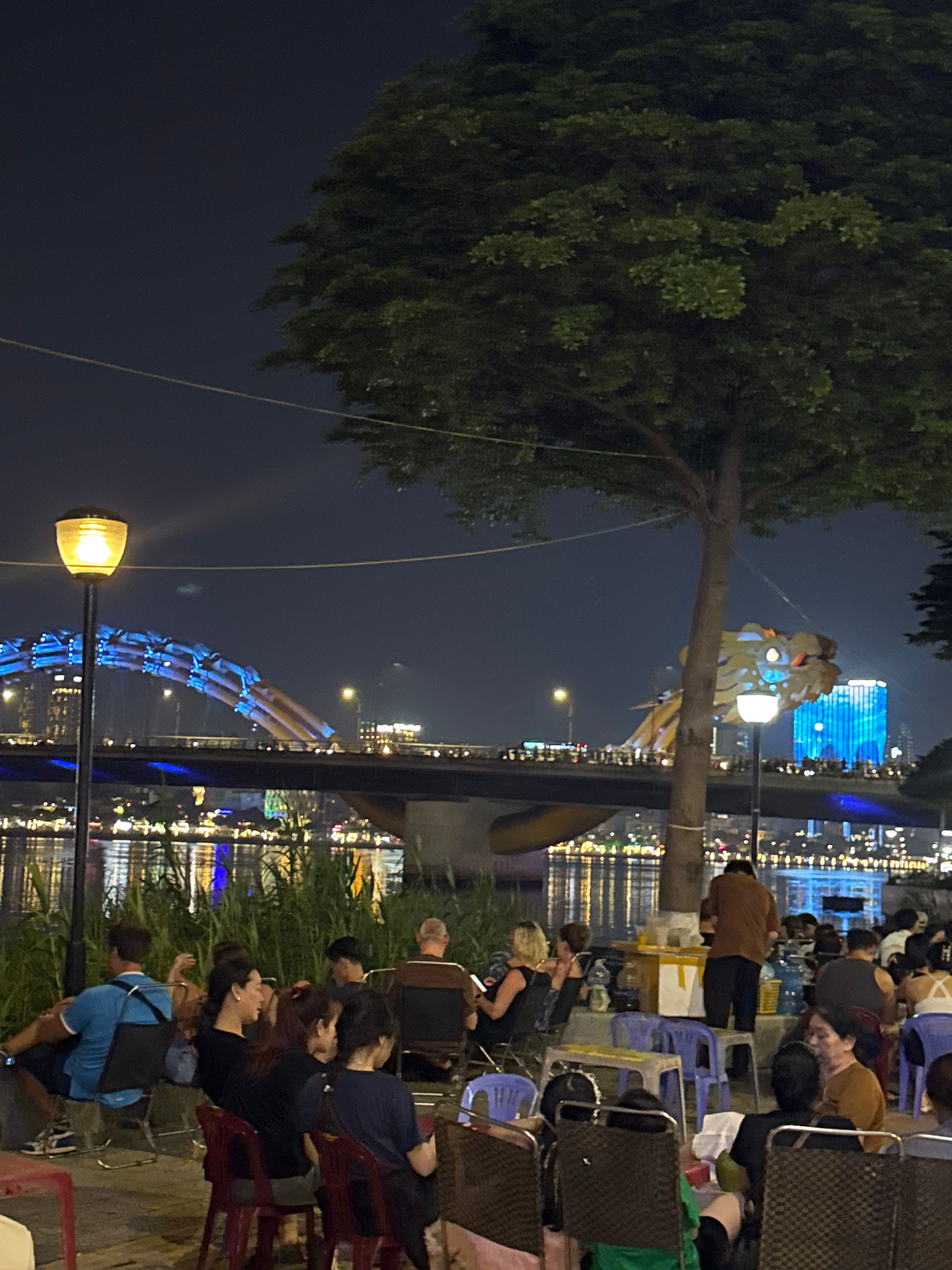 The image captures a nighttime scene in Đà Nẵng, Vietnam. In the foreground, there are people seated on small plastic chairs, seemingly enjoying the view. The central part of the image shows the iconic Dragon Bridge, illuminated with blue lights. It is situated over the Han River. In the background, there are illuminated buildings reflecting in the water, and the city skyline is visible. A large tree with dense foliage looms in the foreground. A street lamp illuminates the scene. A smaller lit statue of some kind sits in the tree. | Open Wire