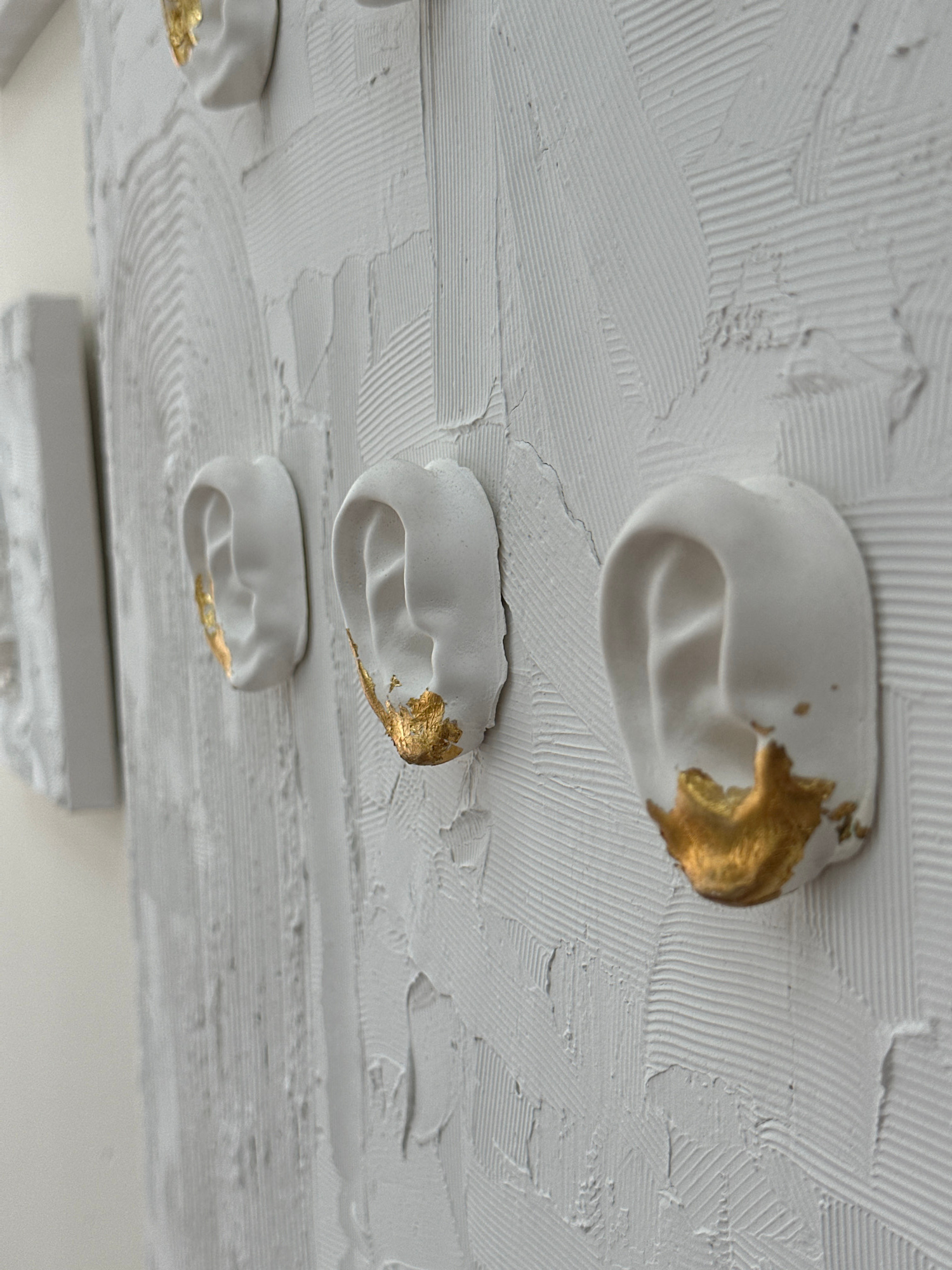 The image shows a close-up of a textured white surface, likely a ceiling or wall. Three rounded, white, semi-oval protrusions with gold leaf accents are embedded within the texture. The surface texturβ¦read more