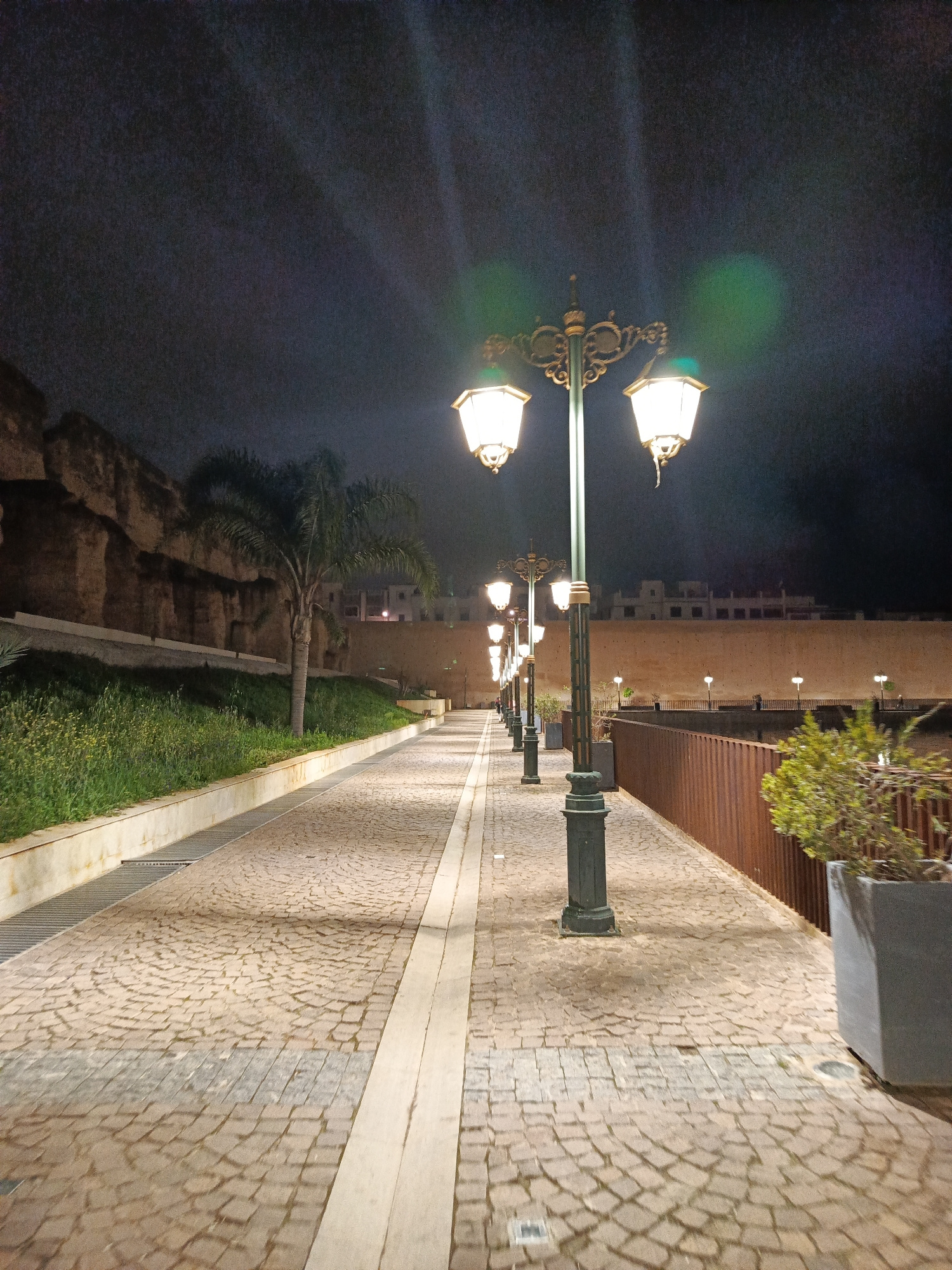 A nighttime view of a cobblestone walkway in Al Machouar – Stinia, Morocco. The path is lined with ornate street lamps, a stone wall with vegetation and trees on one side, and a low fence with potted…read more