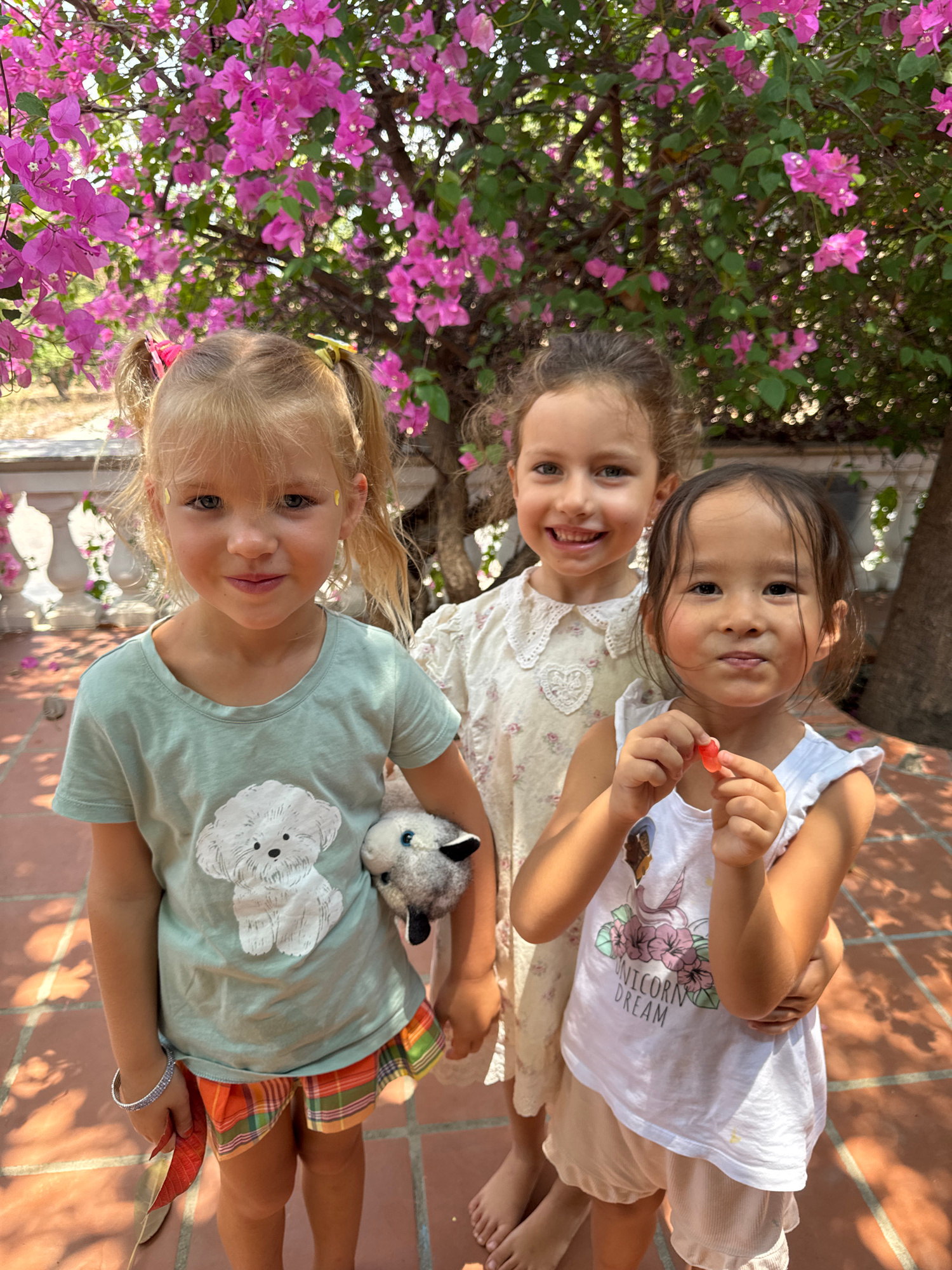 Three young girls are captured in a vertical, brightly lit outdoor photograph, likely taken in Mũi Né, Vietnam, given the vibrant Bougainvillea flowers in the background and the terracotta tiled groun…read more