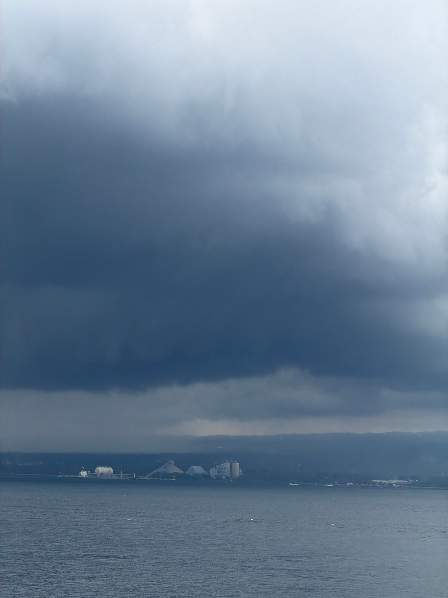 The image depicts a body of water, likely the sea, stretching horizontally across the lower portion of the frame. Along the shoreline, discernible structures suggest a port facility, possibly located…read more