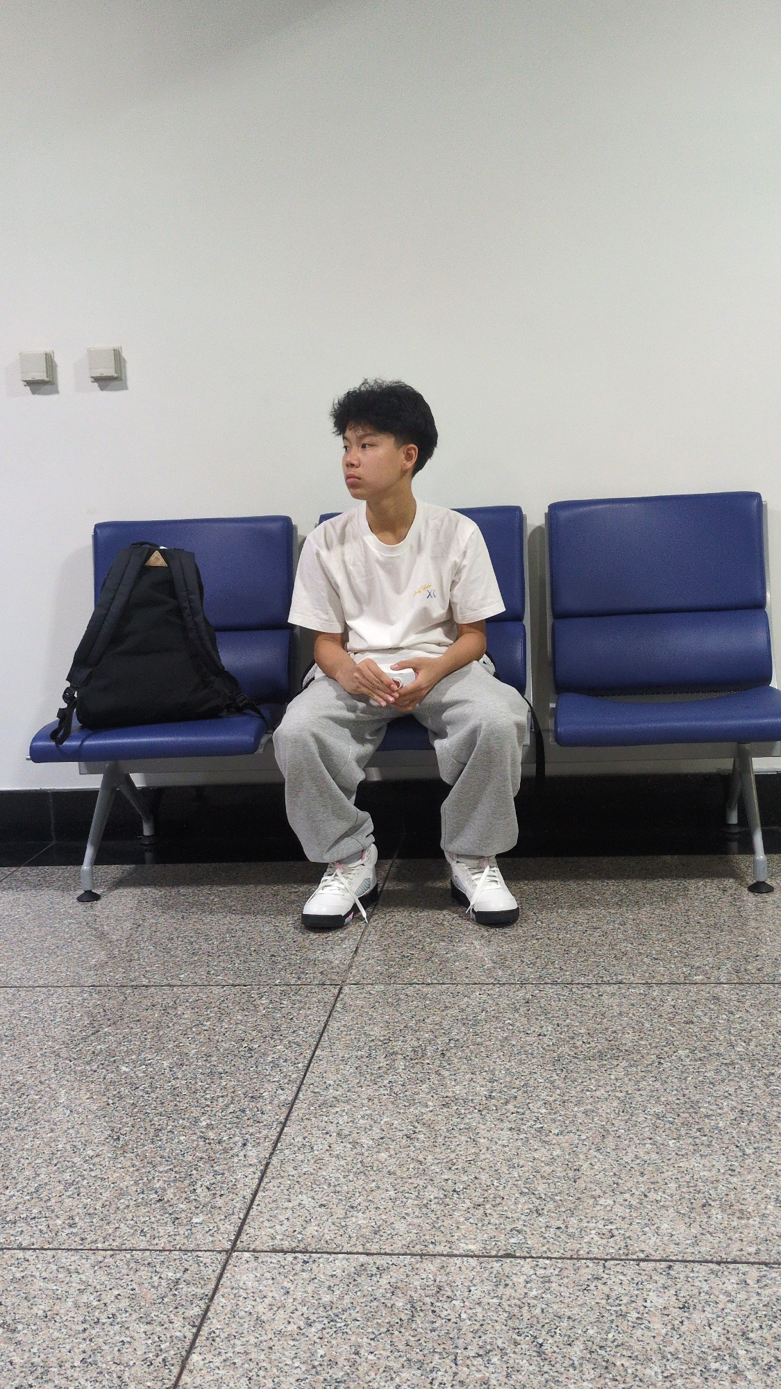 A young Asian male is seated on blue public waiting area chairs in an indoor setting in Thuận An, Vietnam. He is dressed casually in a white short-sleeved t-shirt with a light brown or golden stylized…read more