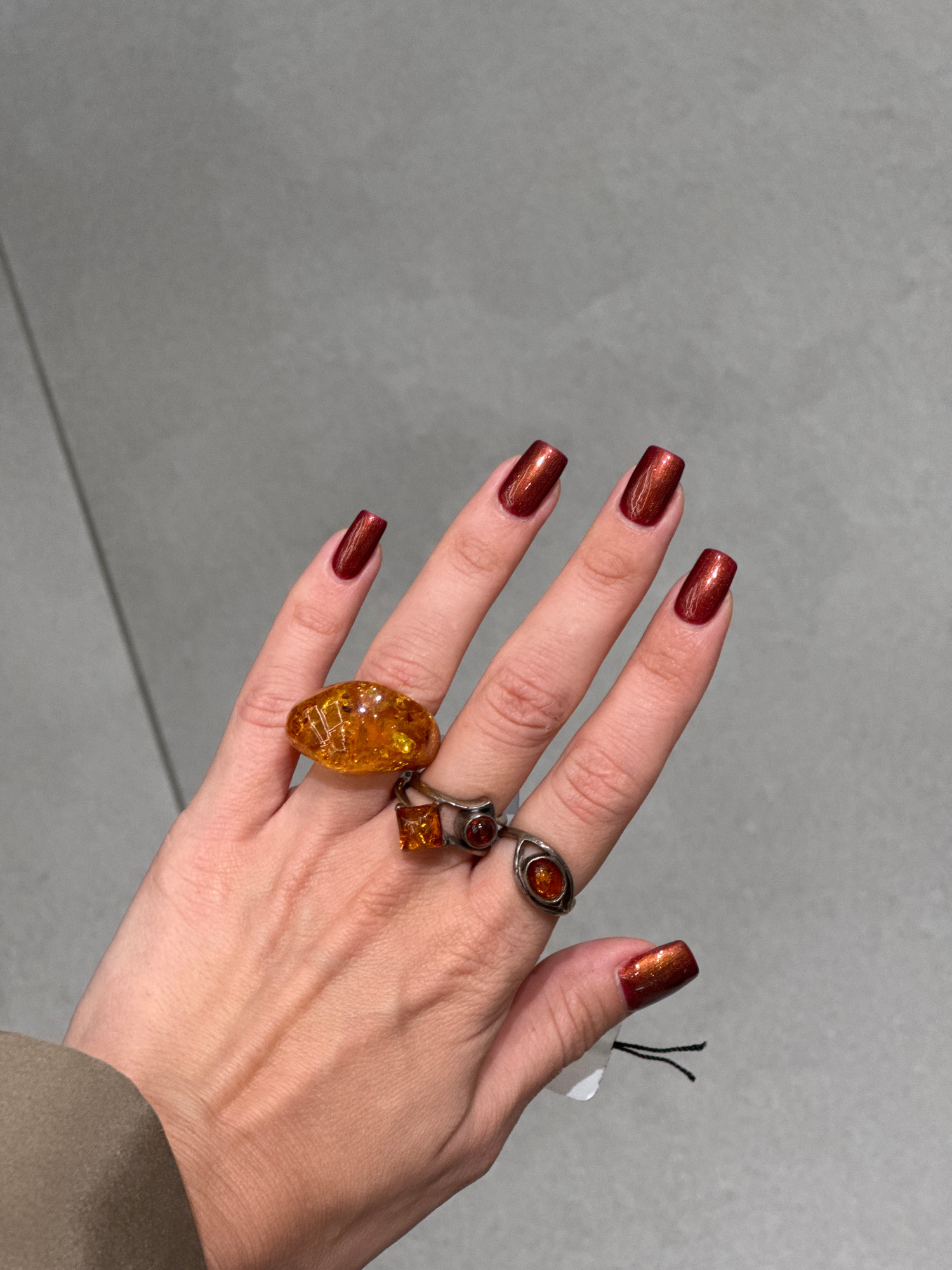 The image provides a close-up view of a person's left hand, likely female, adorned with several rings and manicured nails. The hand is positioned against a plain, light gray, textured background, whic…read more