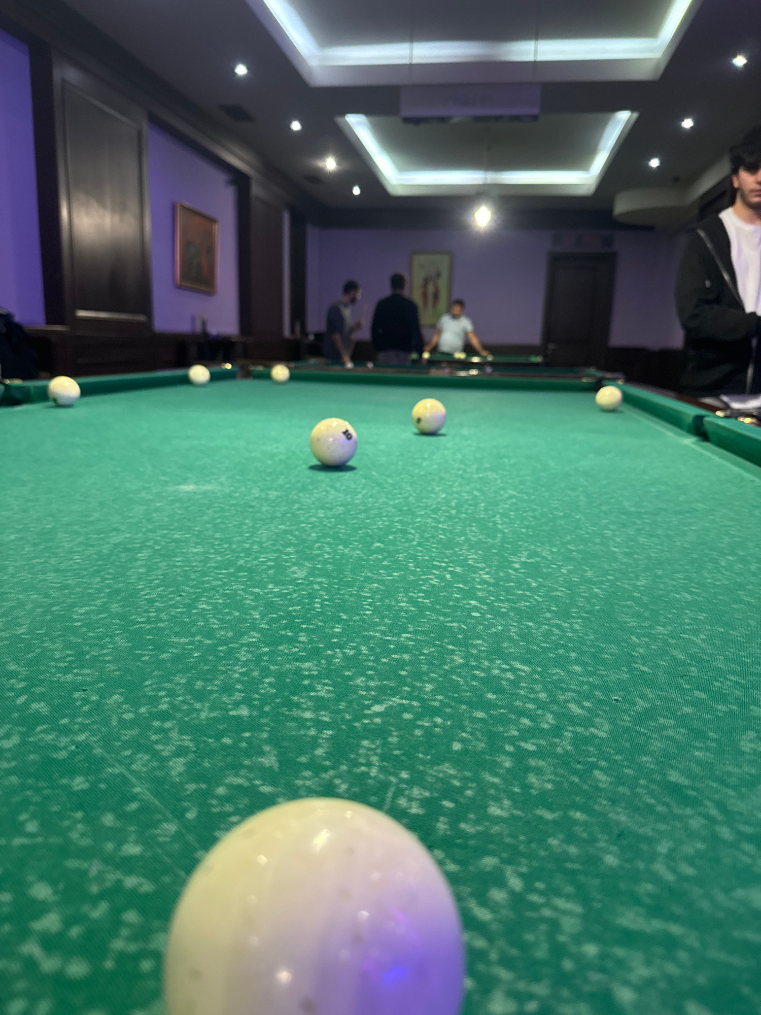 The image shows a billiard table in what appears to be a billiard hall. The table is covered in green felt, and several white billiard balls are scattered across the surface. One ball, prominently pos…read more