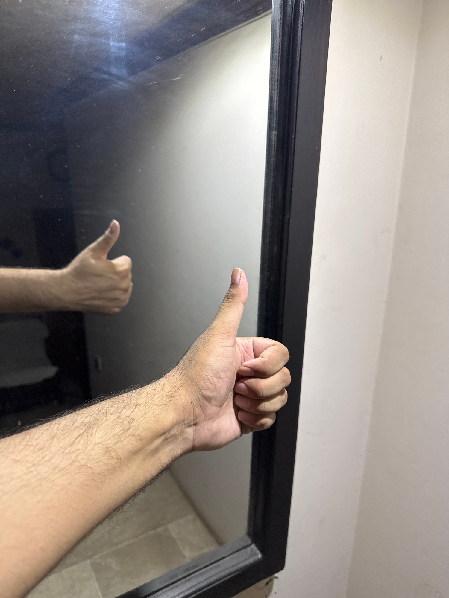 A photograph taken indoors depicts a portion of a mirror with a black frame, reflecting a human arm and hand. The hand, with its fingers curled into a fist except for the thumb extended upwards, is po…read more