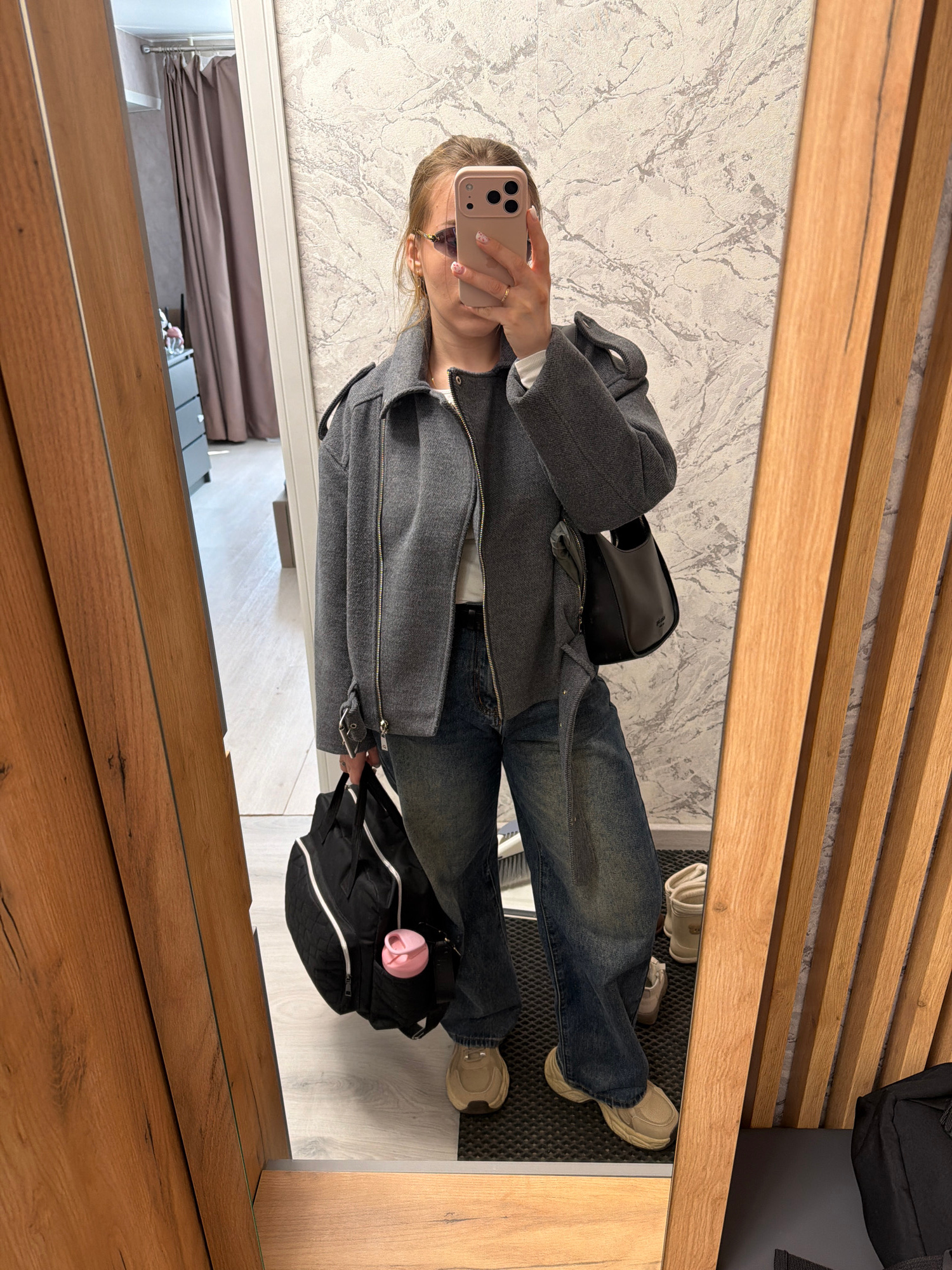 A female subject is depicted in a full-body mirror selfie, positioned within what appears to be a residential entryway or hallway in Reshetnikovo, Russia. She holds a light pink-cased smartphone with…read more