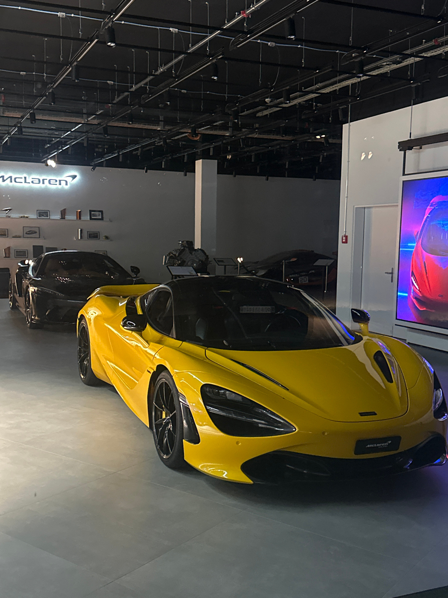 The scene captures the interior of a McLaren showroom in Glattbrugg, Switzerland. A bright yellow McLaren sports car is prominently displayed, its sleek design and aerodynamic features clearly visible…read more