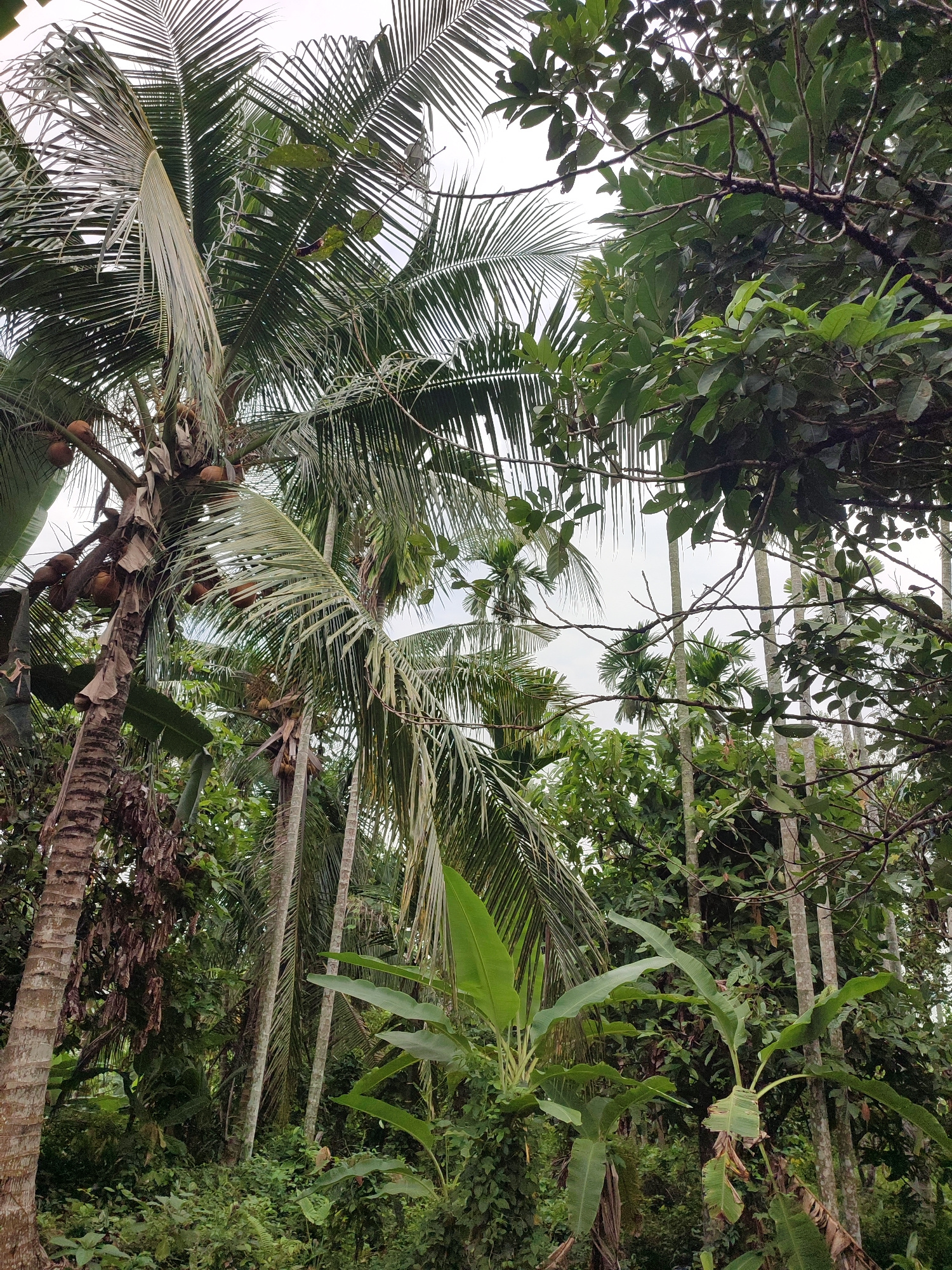 This vertical image captures a dense, vibrant tropical landscape, likely in Saweuk, Indonesia. The scene is dominated by a variety of tall trees and lush vegetation under what appears to be an overcas…read more
