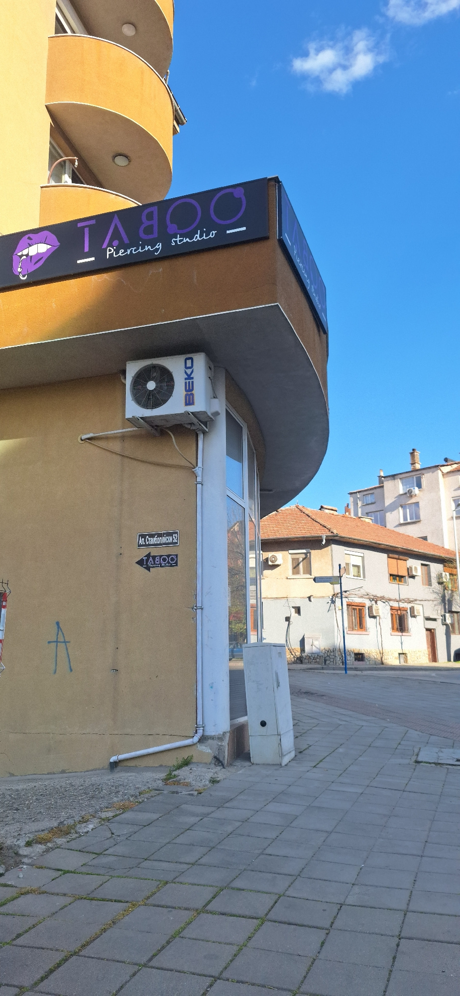 The image shows the exterior of a "TABOO Piercing Studio" in Blagoevgrad, Bulgaria. The studio has a sign with the name "TABOO" in purple vertically, with "Piercing studio" written next to it. There's…read more