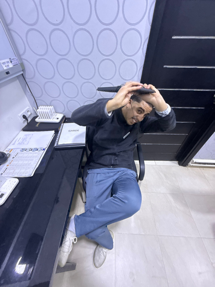 A male individual is seated in a black office chair behind a dark, glossy desk in an indoor environment in Meknes, Morocco. The man wears a dark long-sleeved top over a light-cuffed undershirt, lightβ¦read more