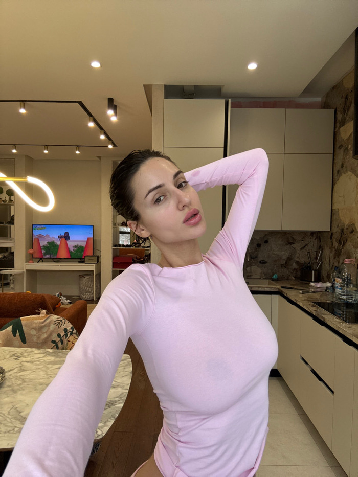 An indoor scene in Khimki, Russia, depicts a female subject taking a selfie. The subject, an adult female with dark, slicked-back hair, is positioned in the foreground, facing the camera with a direct…read more