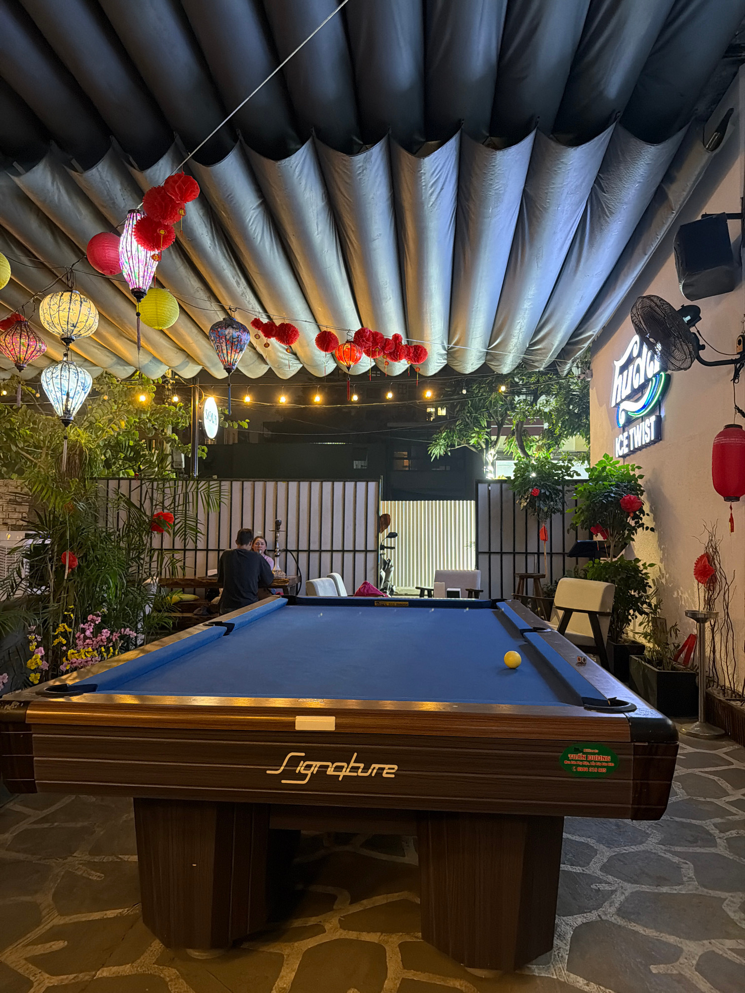 The image depicts an outdoor setting, seemingly a recreational area in Đà Nẵng, Vietnam. A "Signature" brand pool table with a blue felt surface dominates the right side of the frame, positioned on a…read more