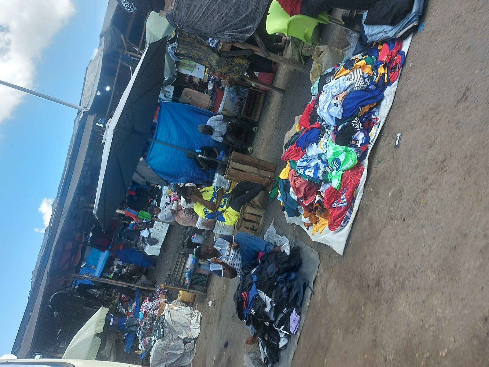 This daytime image captures a vibrant, informal outdoor market scene, likely in Dar es-Salaam, Tanzania. The setting appears to be a busy thoroughfare or dedicated market area with a dirt and concrete…read more