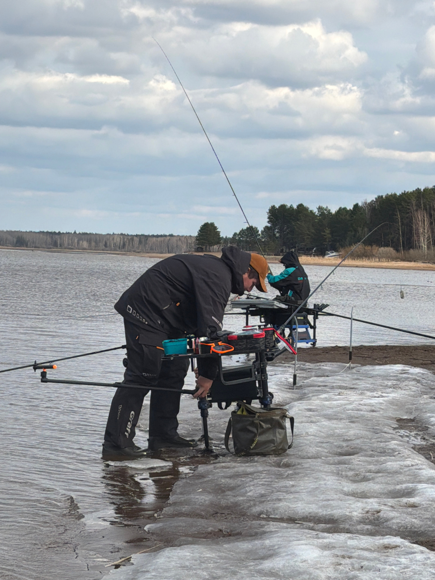 The image shows two people fishing on a lake in Chaykovsky, Russia. They are sitting on specialized fishing chairs with equipment attached, near a shoreline with ice formations. One person is wearing…read more