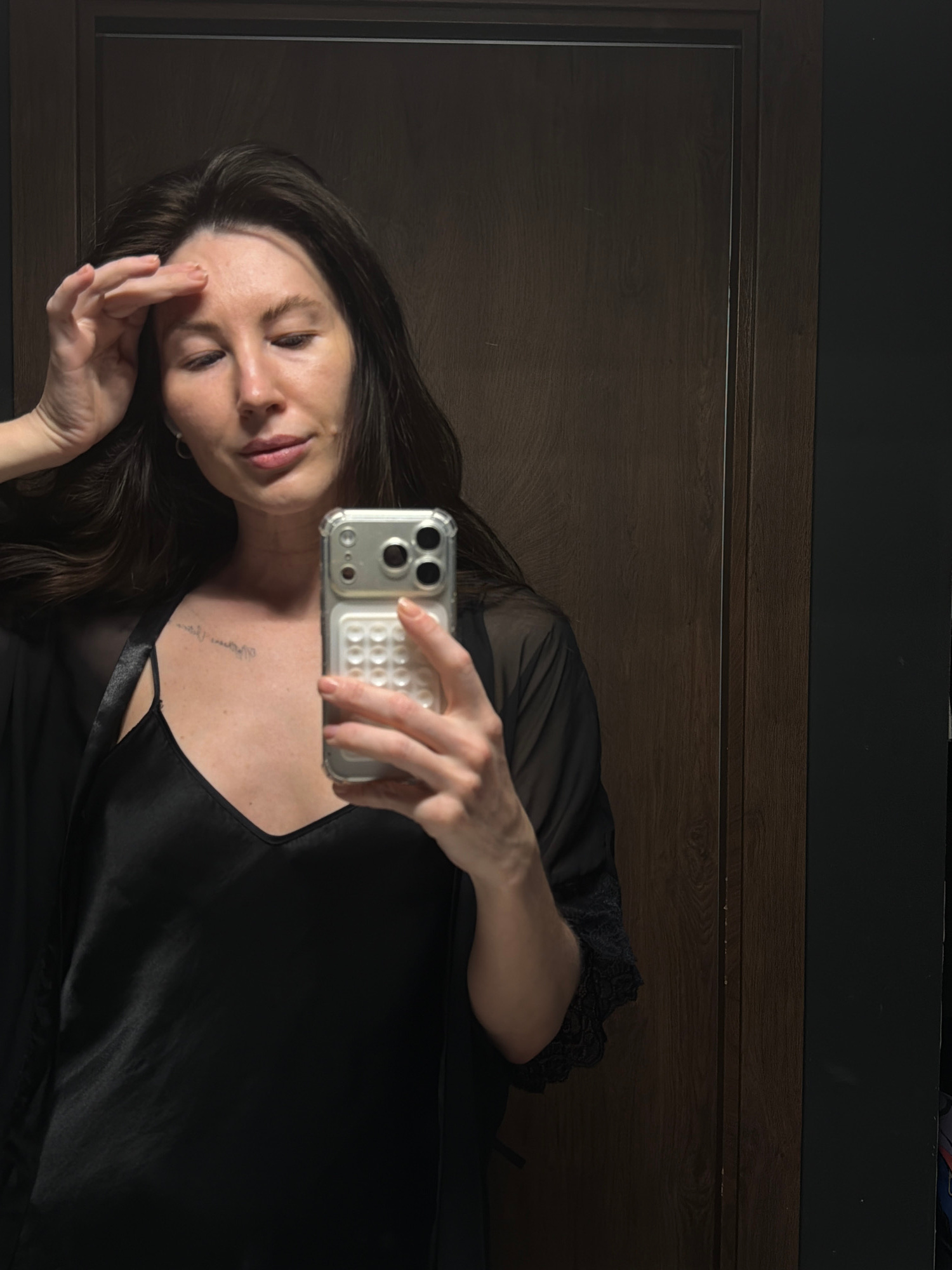 A woman is taking a selfie indoors. She is wearing a black robe with lace detailing. She is holding a cell phone in her right hand. She has dark hair. Her left hand is touching her forehead. A tattoo…read more