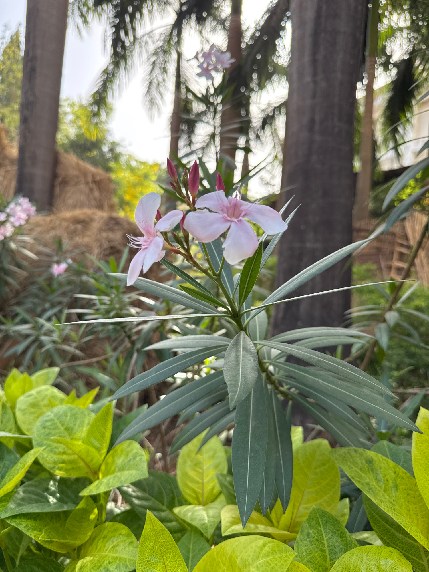 The image shows a close-up of a light pink Oleander flower and its leaves in a garden setting. The Oleander plant also has green and yellow variegated leaves to its right. In the background, a blurry…read more