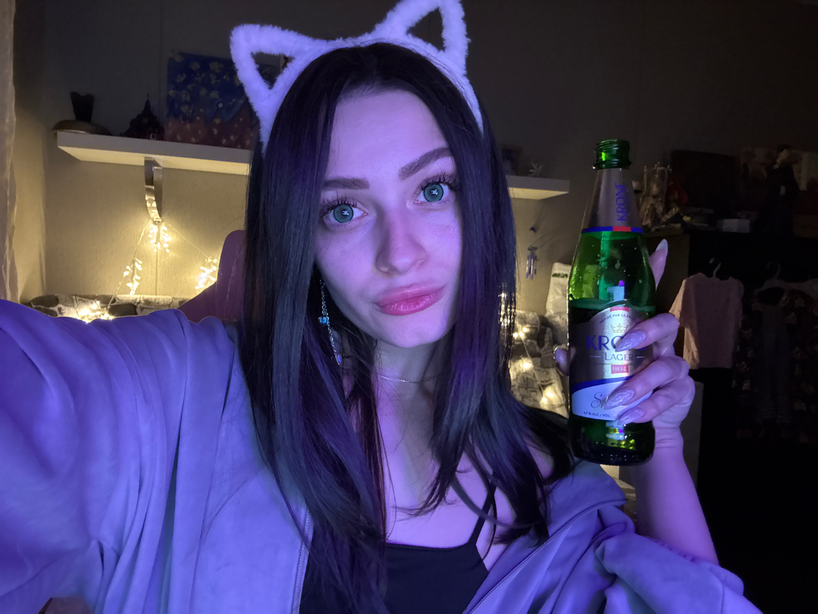 A person with long, dark hair and cat ear headband is upside down in the frame, holding a green glass bottle with a label that reads "KRONE LAGER". The person is wearing a black top and a light blue j…read more