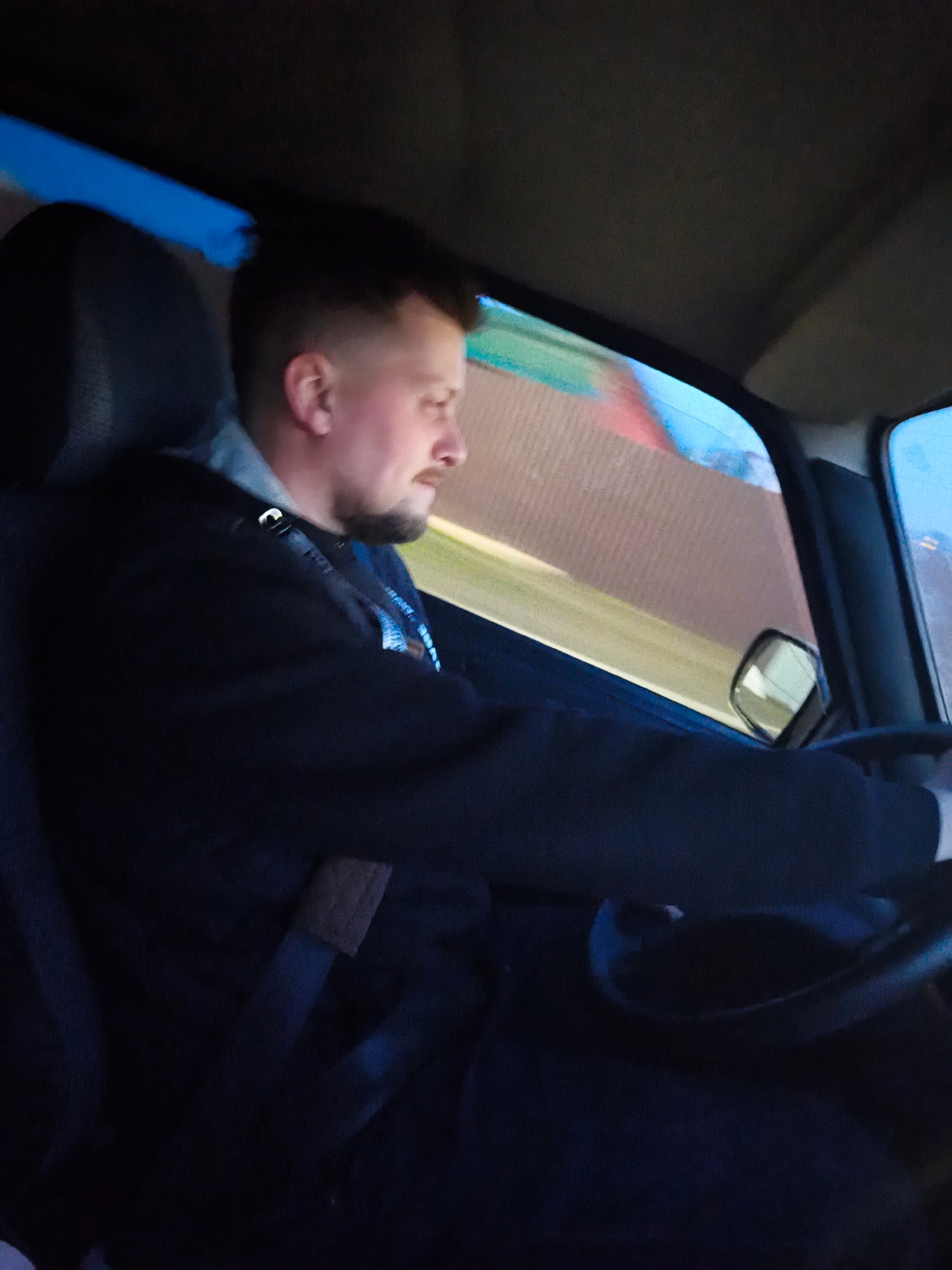 A man is driving a car, presumably in the city of Chaikovsky, Russia. The man is wearing a dark jacket with a hood and a seatbelt. The side view mirror is visible. Outside the window, a blurred fence…read more