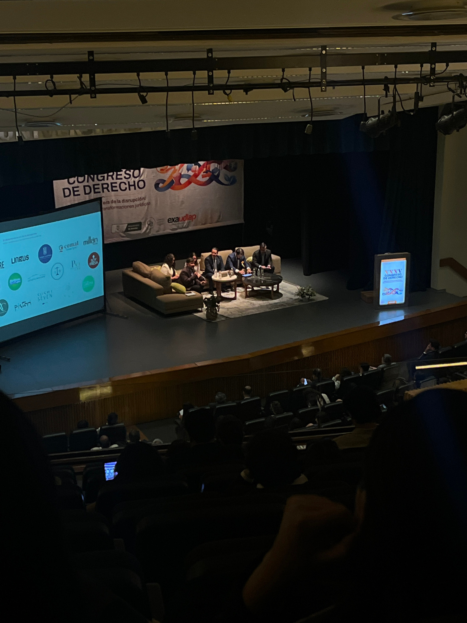 The image shows a view from the audience of a stage in what appears to be a conference hall in San Andrés Cholula, Mexico. The stage has a panel of people seated on sofas and chairs. There's a screen…read more