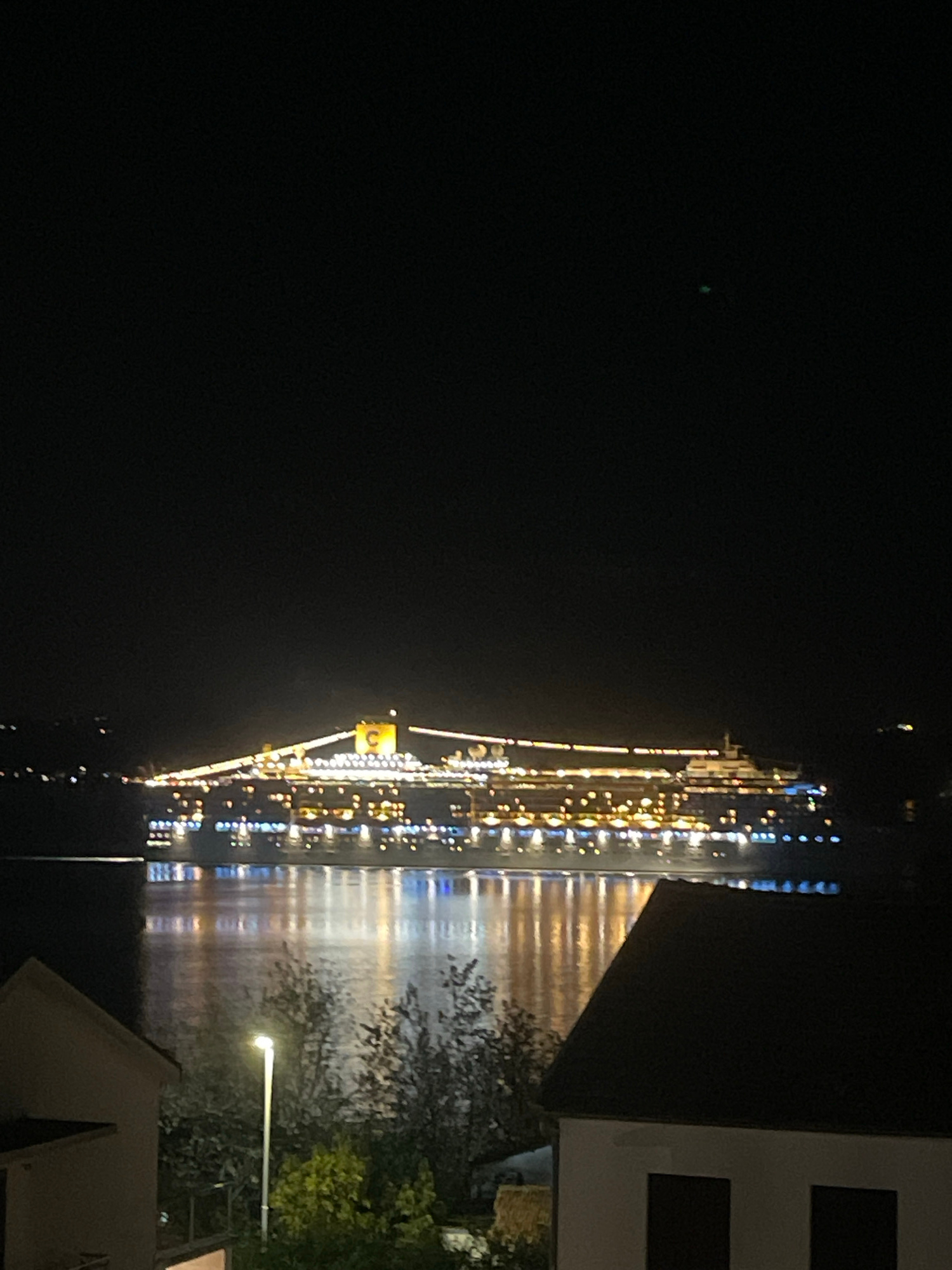 Night scene showing a body of water, likely the Bay of Kotor, with bright reflections from a lit-up structure, possibly a ship or building. The structure has multiple levels and prominent golden light…read more