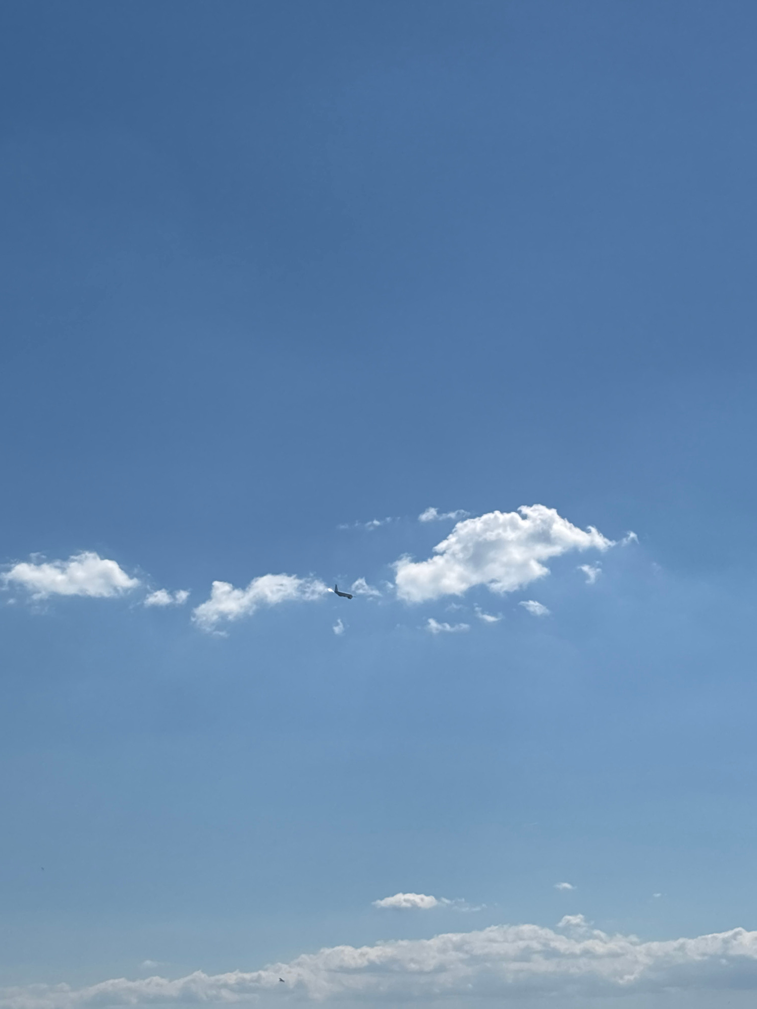 The image shows a vertical view of a clear blue sky in Varna, Bulgaria. A thin line of white clouds runs roughly vertically through the center of the frame. A small airplane is visible within the clou…read more