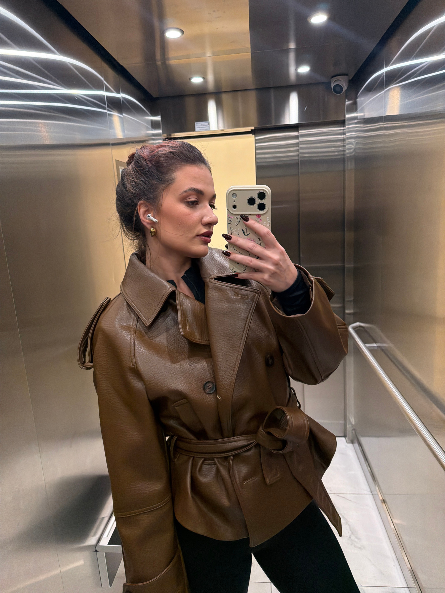 A female individual is depicted taking a mirror selfie within an elevator interior in Belgrade, Serbia. The subject, centrally positioned, wears a brown, belted, double-breasted trench-style jacket ov…read more