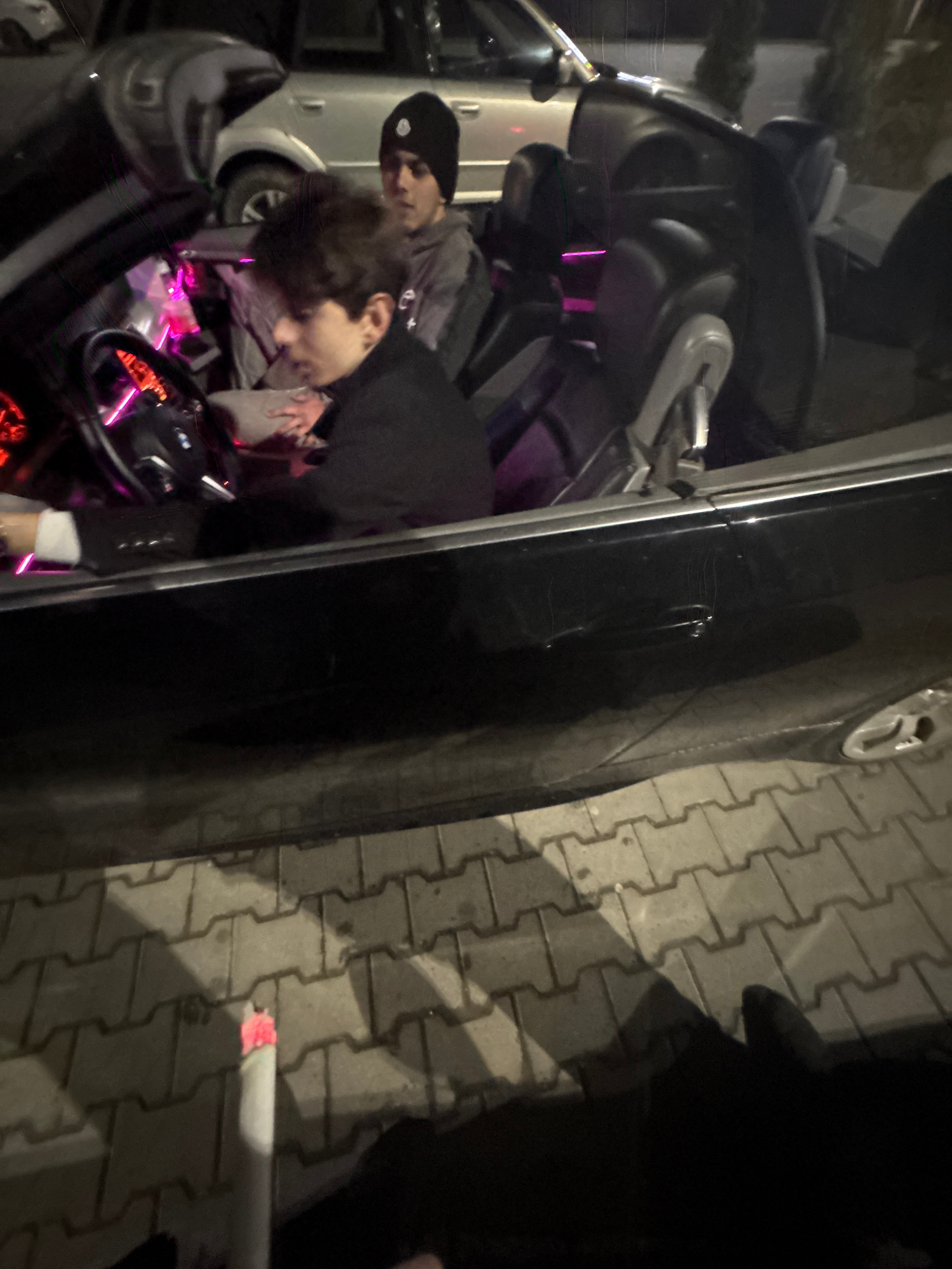 The image depicts two individuals inside a car. One person is in the driver's seat and is actively driving while the other is in the passenger seat. The location appears to be an urban area with paved…read more