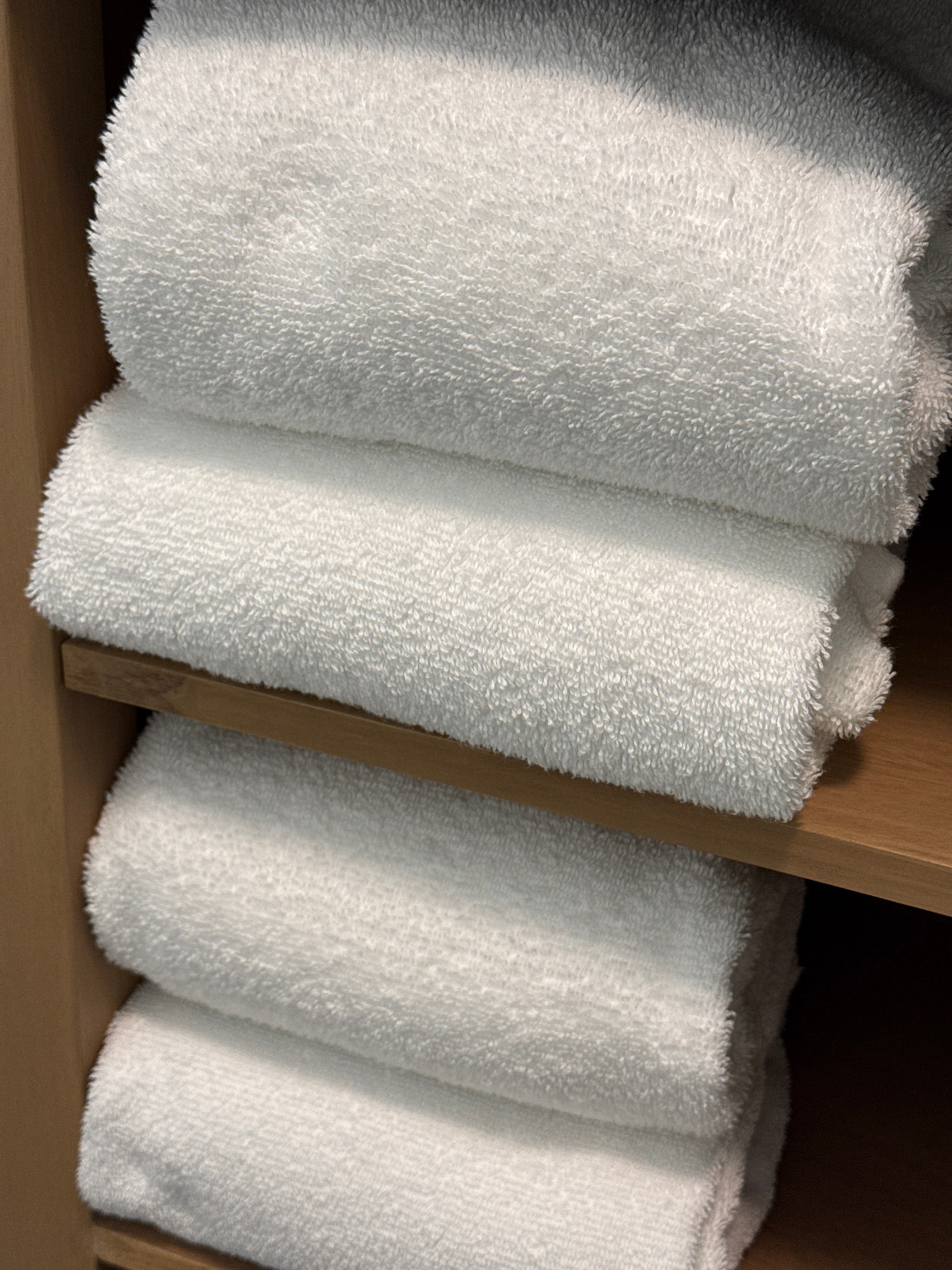 The image shows neatly rolled white towels stacked on a wooden shelf. The scene depicts a storage space, likely in a bathroom or linen closet. There are no people present. Given the prompt, the implie…read more