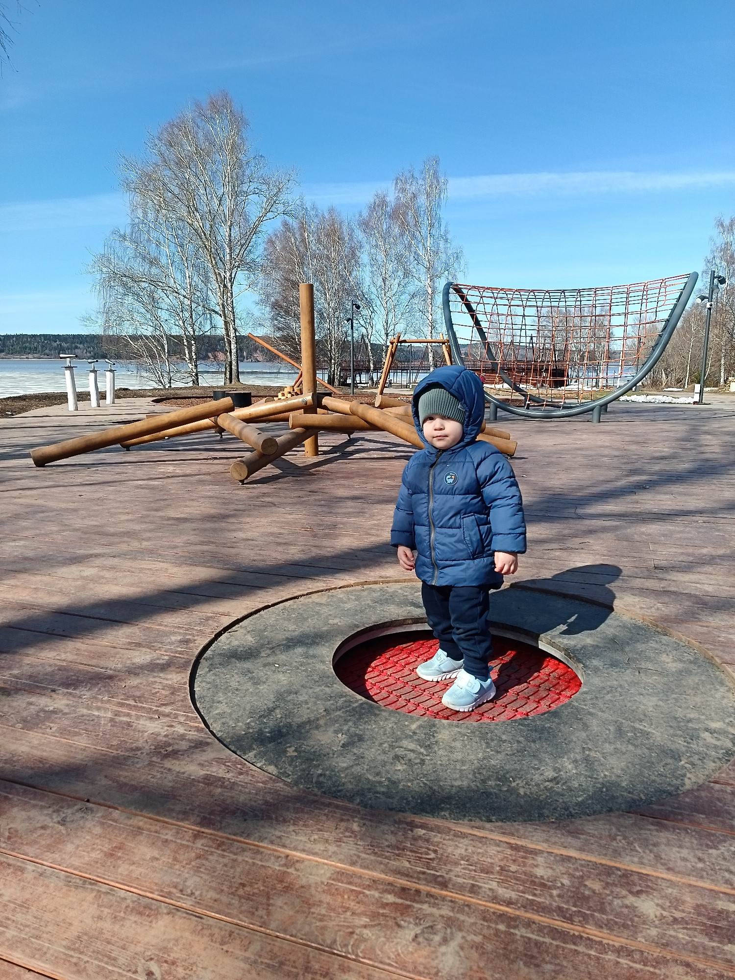 A young child stands on a circular platform in a playground, located in the city of Osa, Russia. The child is wearing a blue puffy jacket, dark pants, a gray beanie, and light-colored sneakers. The pl…read more