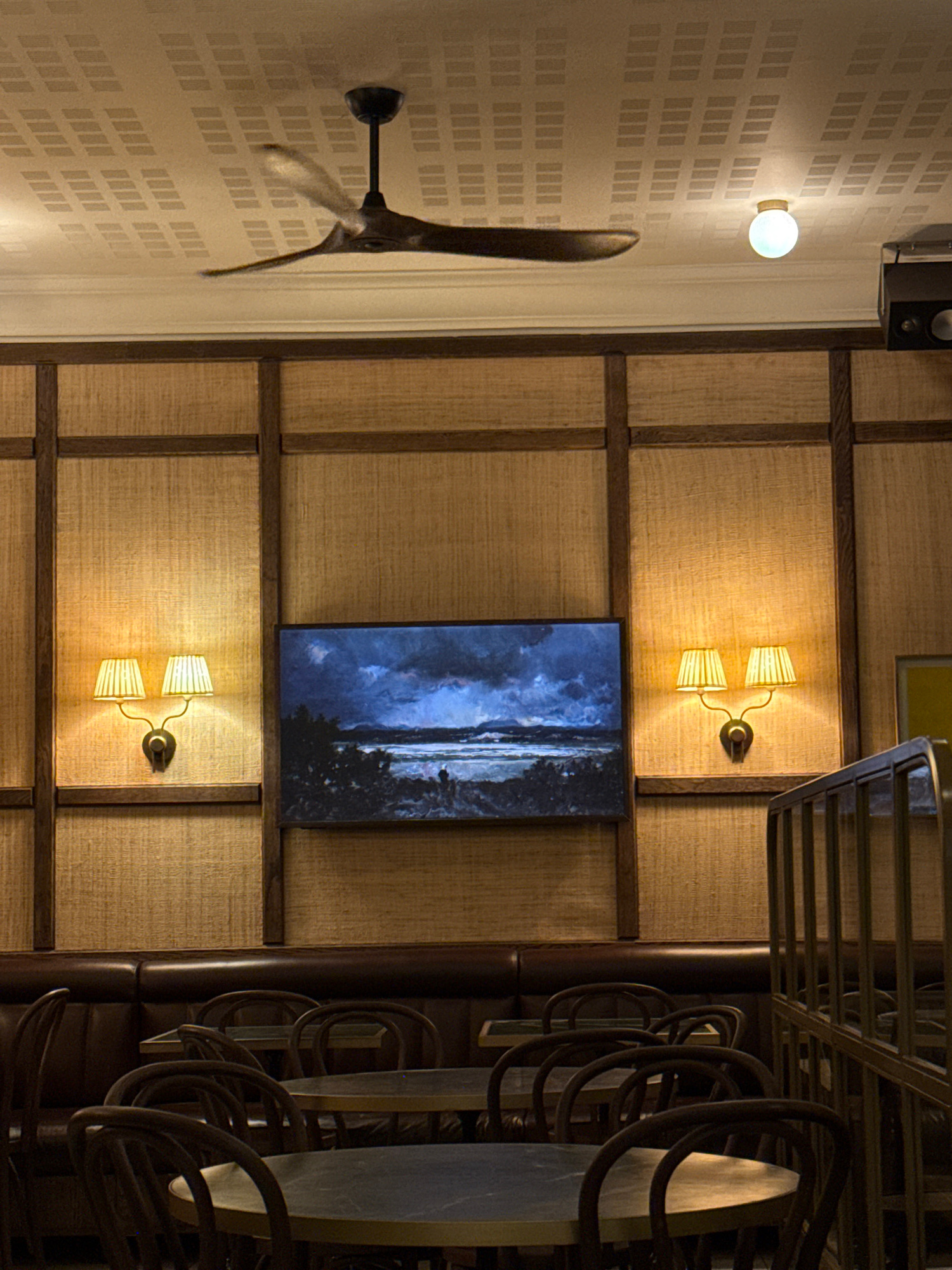 A low-angle, indoor shot depicts a dining area. The scene appears to be a restaurant or similar establishment. The lighting consists of wall sconces with shades on a textured wall panel with brown woo…read more